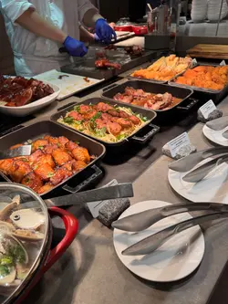 享用了自助晚餐(買2送1,折後每位$578)食物選擇豐富,有冷海鮮(長腳蟹、龍蝦、蟹鉗、蝦、青口、小龍蝦、煙三文魚)、刺身、壽司。有日式串燒(蝦、秋葵、牛肉、多春魚)、燒蠔、燒龍蝦、螺肉。中式熱葷包括鮑魚鵝掌、蒸石斑、燒乳鴿、炸蠔、蜜豆蝦仁、炒飯、炒菜。西式有即煎羊架、鵝肝、煎牛扒、即切肉眼、西班牙乳豬焗飯。另外有印度咖哩、即煮粉麵、燉湯。甜品方面,有楊枝甘露、焦糖燉蛋、各類迷你布丁、蛋糕仔,亦有即造梳乎厘及朱古力心太軟。味道方面,鮑魚鵝掌入味,鮑魚軟腍,鵝掌有骨膠原口感醬汁的調味恰到好處。蒸石斑軟滑魚味濃,鮮蝦和青口爽口,燒乳鴿脆身開胃。芝士焗龍蝦肉質彈牙,芝士汁入味。焗蠔鮮甜濕潤,燒牛肉串腍身肉汁香濃,串燒蝦爽口鮮甜。花膠雞腳燉湯用料豐富,有一條花膠及一隻雞腳,花膠軟滑、骨膠原充足,雞腳腍身,雞湯清醇。海鮮冷盤亦質素佳,煙三文魚滑不溜口;長腳蟹充滿海水味,新鮮而肉質一梳梳的。蟹鉗啖啖肉,口感極佳,使人滿足;小龍蝦肉質煙韌。再點了一塊肉眼扒,肉質細嫰肉味濃郁。燒銀雪魚甜美,輕輕咀嚼已可咬開。青酒煮蜆清甜入味。牛肉炒烏冬醬汁味道極佳,充滿日式風味。甜品亦用心製造,一絲不苟。焦糖燉蛋外表糖衣香脆,蛋漿味濃滑溜。楊枝甘露簡直是人間滋味,絕對值得一試。即造梳乎厘軟滑微甜,帶來幸福感。其他甜品亦手功精緻,味道不俗。整體食飯質素極佳,喜出望外。服務方面,每位服務員都充滿笑容,細心有禮。環境方面,裝修優雅舒適。…查看更多