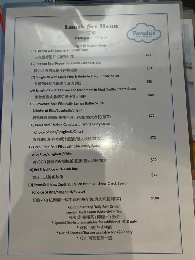 太子呢邊都唔少食肆~ 今日晏晝黎到呢到見到呢間Cafe嘅menu幾特別!! 就同朋友一齊入黎試下!Menu嘅午餐下午茶價錢都好抵😆仲有餐湯同野飲!最特別竟然係有石燒牛食!就吸引左我地入去試下了🤣🤣🤣入到黎見到環境都幾舒服,係好啱朋友一齊坐低食野傾計嘅餐廳👍🏻🤍薯仔忌廉湯食得出好多薯仔!忌廉味好濃但飲落都唔會太膩~🤍石燒200g 紐西蘭一級牛肩胛肉(意粉等左一陣就上菜了!牛扒好長好大塊 但就比較薄所以店員都提我地燒熟左就要夾起了 好貼心~牛扒肥瘦都均勻 有肉味!個餐仲比左兩個汁 任君選擇~~🤣🤣🤍青檸荔枝梳打驚喜地唔會太甜!係夏天消暑嘅好選擇😆🤍意式茄醬肉丸肉丸高質!用鐵鍋上枱熱辣辣~仲有好多洋蔥!係好豐富嘅小食🥹🤍水牛城雞翼一黎到勁吸引!😍係啱啱炸好嘅雞翼+水牛城醬🥹入口又脆又香~🤍是日蛋糕如果冇記錯應該係玫瑰荔枝芝士蛋糕!唔會太甜亦都唔會太膩!入口感覺輕身~整體評分:🤍🤍🤍牛肉質感不過不失~但小食同甜品賣相吸引😍又有誠意黎開太子揾cafe可以一試!…Read More