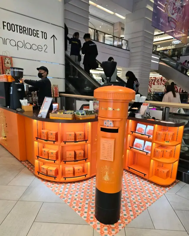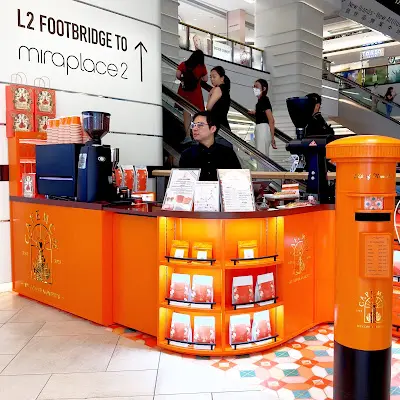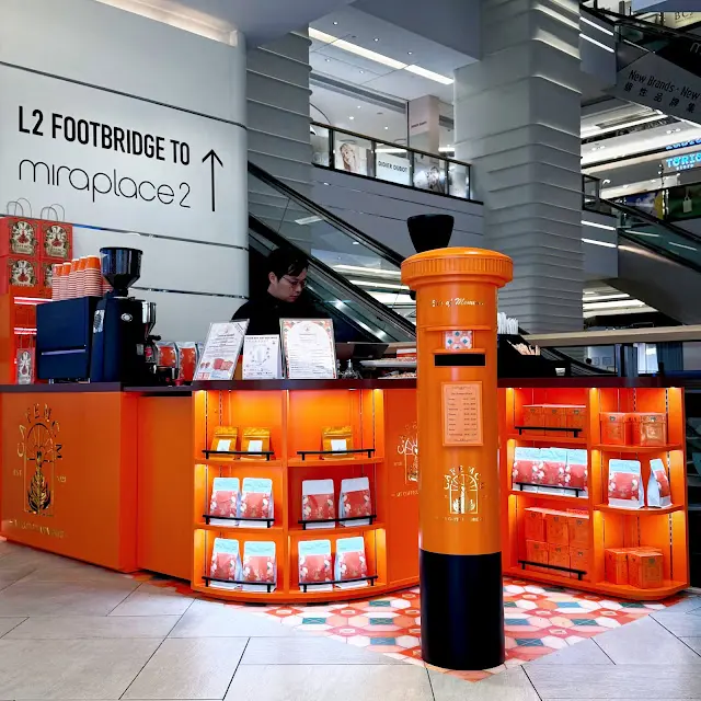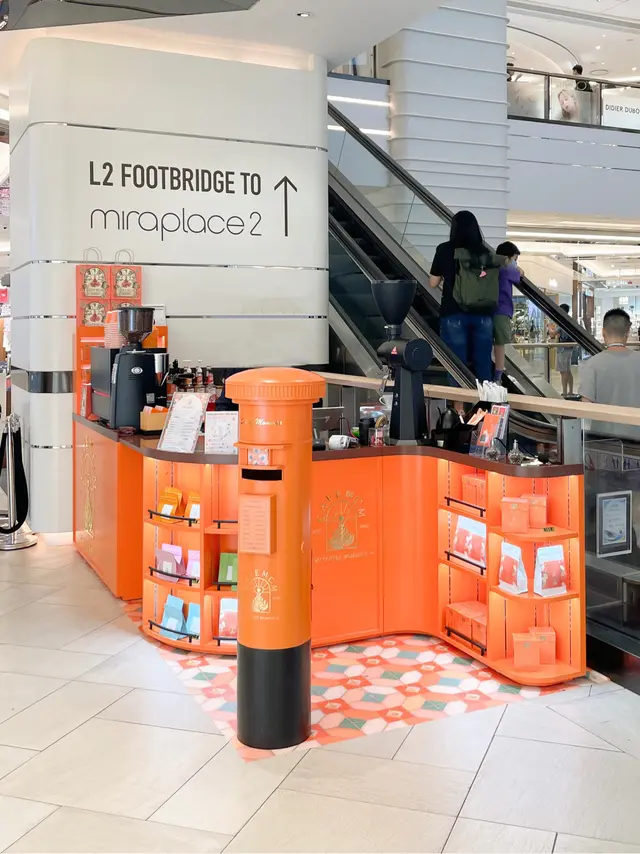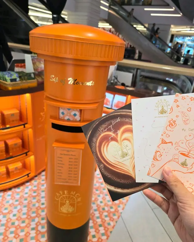 I came across this bright orange coffee stand called Cafe MCM in Mira Place. MCM stands for My Coffee Moment. I had never noticed it before and went to take a look. The barista was very enthusiastic and explained what they were about. They served various coffee (and non coffee drinks) along with a few signature drinks as well. All for takeaway. Coffee beans both whole version, ground version and convenient drip bag versions were also for sale because they roast their own beans.They have a bright orange mailbox in the middle. This is an interesting idea. You can choose a postcard, write a message, pop it into the mail box and they will send it for you. I tried it and wondered when boyfriend will get his mail?They had so many different postcards to choose from as well.As they roast their own coffee, they had these two intriguing perfume bottles filled with coffee. You can squeeze it to smell their product. Interesting way to keep the scent of the coffee fresh.Cookies are also for sale.Menu is in English and  Chinese. I decided to get a latte ($42).A cute little heart was drawn on top. The coffee was very good. Rich and robust with an intense nutty flavour. A good temperature and right ratio of milk to espresso.I was about to leave when I was informed to open the door to the cupholder. Peeling it back, there were words: Good Coffee, Good Day. How absolutely correct! Apparently every one is different. Just like a fortune cookie! Will definitely be back for another cup.查看更多