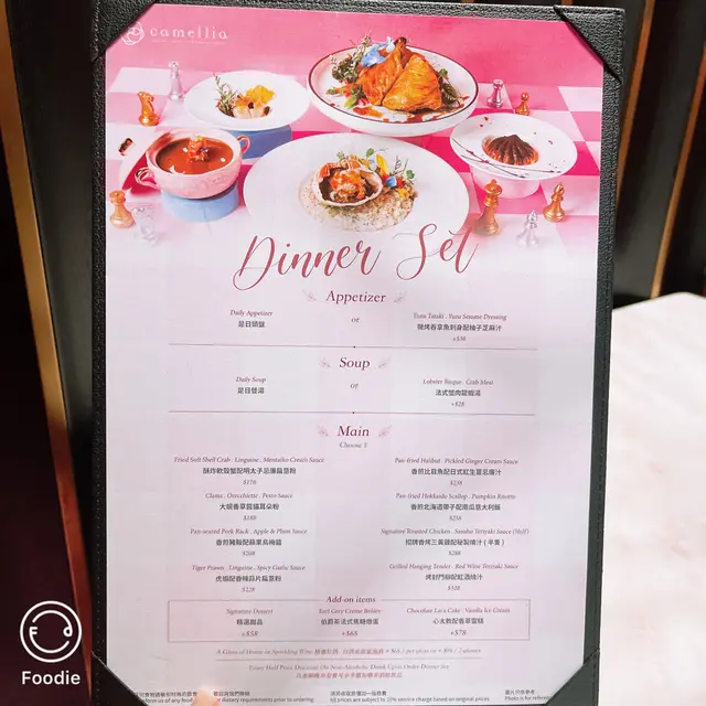 餐廳以山茶花為主題,店內有以9999朵山茶花砌成的花牆,十分適合拍照打卡。餐廳主打「Camellia Fiesta Afternoon Tea Set」,以雲朵鮮果乳酪杯作主打,打卡度一流;另外亦提供主食如意大利飯,素面,薄餅等。