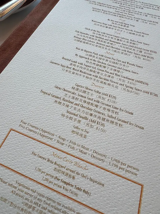 👉🏻MENU CONNAISSEUR (DINNER)💲4,128pp1️⃣Alaskan King Crab Crustacean Jelly, Gillardeau Oyster and Osciètre Prestige Caviar from « La Maison Kaviari »2️⃣Marinated Japanese Seabream, Tomato and Shrimp Heads Juice Cream3️⃣Brittany Blue Lobster and its « Nage » Emulsion, Flavored with Yuzu, Coriander and Sumac4️⃣Roasted Langoustine from Norway with Eggplant, Ruby Sauce5️⃣Roasted Pigeon from Brittany with Textures of Beetroot and Cherry, Pigeon Juice6️⃣Japanese Saga Beef, Zucchini Flower Stuffed with Summer Vegetables, Beef Juice with Blackcurrant (Supplement💲500)(truffle supplement💲500)7️⃣Caprice Cheese Cellar8️⃣Pistachio Soufflé, Raspberry Sorbet9️⃣Coffee and Petit Fours-好似冇想像中咁好食🤣不過成個用餐過程係幾舒服的!唔會好拘謹 唔知係咪因為我哋飲咗酒😹(香檳紅酒白酒飲都晒再飲就搞唔掂🙂↕️)賣相方面冷盤嘅seabream最深客印象 刺身切片砌成玫瑰花幾靚🌹和牛超軟熟😋但係成餐飯令我最有印象嘅係cheese cellar🤣揀咗隻硬cheese食落好似鹹蛋黃味好得意!配埋蜜糖同埋個梨醬都真係幾好食😬不過喺我印象中香港嘅法國餐廳都係amber/racines好食啲😳Rating: 7.5/10〰️〰️〰️〰️〰️〰️〰️〰️〰️Caprice (Central)📍6F, Four Seasons Hotel Hong Kong, 8 Finance St, Central…查看更多