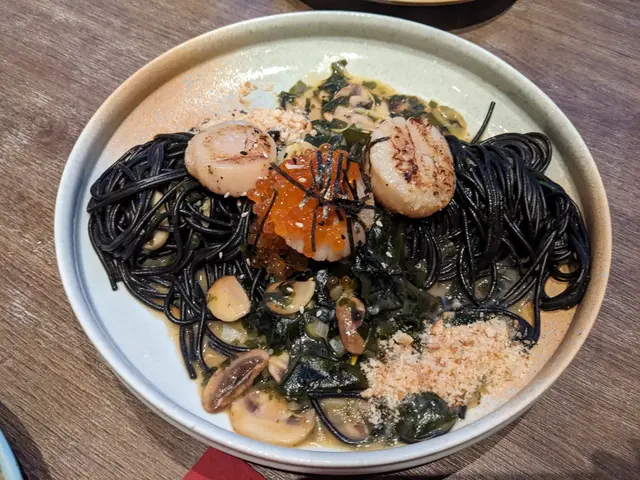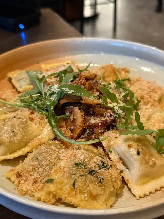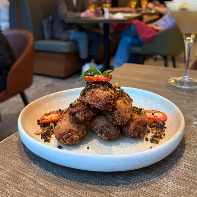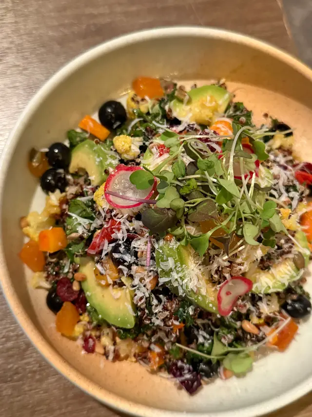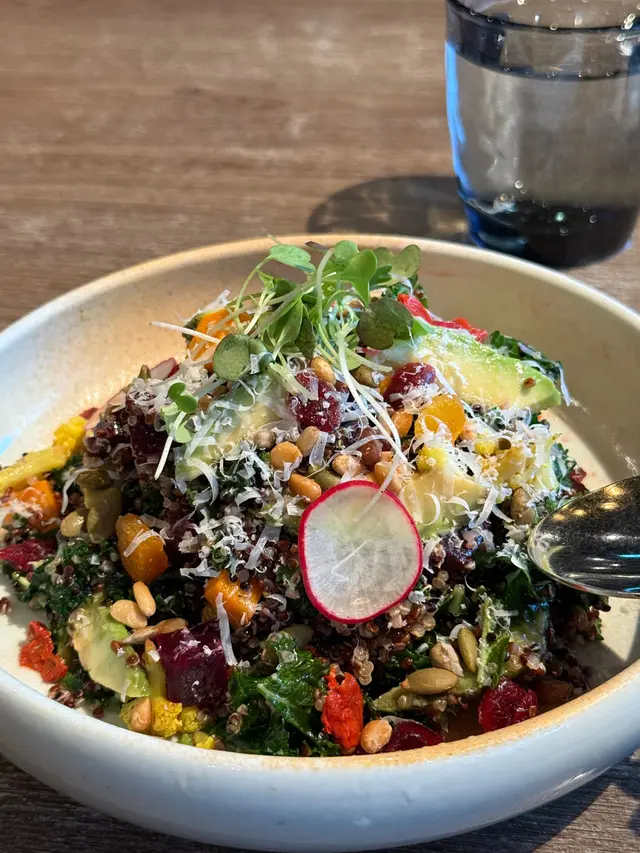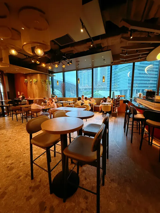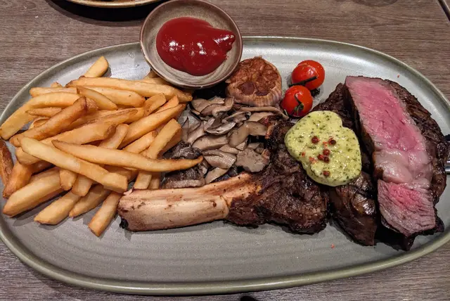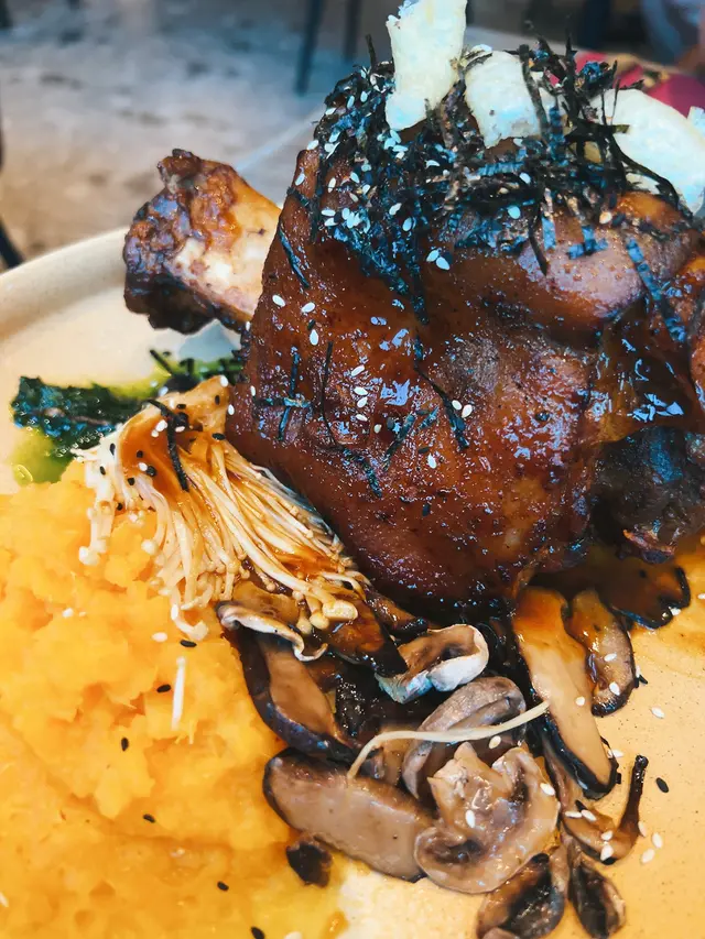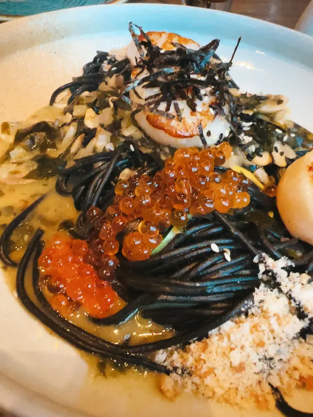 啟德地方真大,約朋友一齊逛完後來餐廳食晚飯。餐廳很大,近門口有商品及精緻麵包,每款都望下,色彩繽紛; 餐廳有酒吧區、生蠔專櫃、存放肉類待熟成的大櫃等,目不暇給,觀感及印象不錯!坐好後討論究竟是主戰生蠔飲啤酒還是食薄餅,有共識後選擇肉食,當然要食沙律再食肉!Smoked Salmon & Prawn Salad 煙三文魚海蝦半熟蛋沙律 $168聞到幾香水果味及少少酸味,酸味是來自沙律汁,材料豐富,幾款蔬菜、蕃茄、煙三文魚、海蝦、水果等,酸酸甜甜幾開胃。Happy hour 時段有八折優惠,想飲百香果,揀一杯Mocktail Peachy Passion 桃紅莓百香果 $76 顏色很美,無鮮明果味 ,凍飲亦太多冰,令味道極淡,感覺價格與品質不符!Super Food Salad 藜麥藍莓杞子牛油果羽衣甘藍沙律 $148沙律同樣材料豐富,有牛油果、羽衣甘藍、藍莓、黑橄欖、芝士及很多很多藜麥等,食得健康又開心!Vegetarian Coca Bread Pizza 素菜西班牙薄餅 $158薄餅賣相很美,尤其芝士碎有點似飄雪,又有蕃茄、茄子、洋薊等。餐牌註明有牛油果醬但較難食出牛油果醬味道,咬落幾juicy,薄餅餅底好薄,餅底與餅邊很脆,如法包般的脆,是食過最脆的薄餅喔!Roasted Suckling Pig 烤乳豬配紅甜椒堅果醬水欖車厘茄薯仔 $288烤乳豬有陣陣飄香,幾大件,乳豬皮好薄,一邊切一邊聽到乳豬皮的爆裂聲,乳豬有油香有味道,一致評為好好食!進餐期間侍應們不停更換餐碟,每一位侍應都是笑容燦爛,讓我們食得舒適!Pork Tomahawk 慢煮黑豚斧頭扒蘋果青醬酸忌廉薯仔 $268配菜同樣有薯仔,薯仔混入酸忌廉好食又夠腍。黑豚斧頭扒較乾身,有咬口不夠腍。蘋果青醬多一點會較好,配菜薯仔被評為最好食。Scallops Ink Spaghetti 北海道帶子海膽醬墨汁意大利麵 $198食材有帶子、三文魚籽、紫菜絲、菇、黑白芝蔴等,意大利麵軟硬口感佳,雖然海膽醬的味道不太突出,但食材混合好後非常鮮美,意外好食!Augus Ribeye 乾式熟成黑安格斯肉眼扒薯條什菇香草牛油 600克 $628好大件肉眼扒,烤紋好美,薯條香脆好食,乾式熟成黑安格斯肉眼沒有太多肉汁,所以香草牛油是必須的。較生的位置較難咬開,幸好肉眼扒大部份都是較腍,牛味濃郁好食,乾式熟成確實與別不同!各款菜餚精緻,賣相及品質上好,六人分享多份主食剛好,烤乳豬和乾式熟成黑安格斯肉眼扒一致評為最好食,再加上更換餐碟的侍應以致結賬的服務員態度親切及笑容燦爛,是少有的極佳體驗,超讚!…查看更多