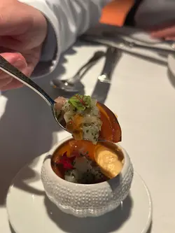 是日周年紀念,老公仔book左呢間靚靚法國餐廳🥰5-course set dinner 啱晒我哋呢啲唔想用腦嘅懶人😆starter 我地揀咗加拿大海膽燉蛋配甜蝦他他 同 香煎法國鵝肝伴蘋果蓉配砵酒呢度嘅鵝肝是我成世人食過最好食嘅鵝肝😳😳好香好rich,調味亦非常好,經理話呢道鵝肝係餐廳嘅signature ,果然一流👍🏻👍🏻👍🏻再來係麵豉忌廉湯配蜆肉,夠creamy而且帶點麵豉味,冇平時嘅忌廉湯咁悶,唔錯😋主菜前先來個自製檸檬雪葩,清一清味蕾~我地非常欣賞呢度嘅炭燒美國天然頂級西冷扒配紅酒汁,牛味香濃,外層焦香,中間粉嫩,medium rare 簡直係perfect😱煙燻鹵水乾式熟成法國白鴿配菠蘿果醬,熟成過嘅白鴿肉味更濃郁,而且肉質軟嫩,唔錯👍🏻最後嚟到甜品,法國朱古力暖心布甸伴雪糕,暖暖嘅心太軟加埋冰凍嘅雪糕,甜到入心🥰芒果忌廉配杏仁蛋白酥伴士多啤梨醬,感覺清新唔會膩,連甜品都好出色👍🏻因為食牛扒而叫左兩杯紅酒,後來經理仲話呢度冇開瓶費,可以盡情帶自己想飲嘅酒嚟😳😳…查看更多