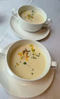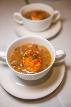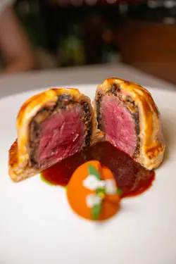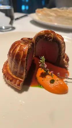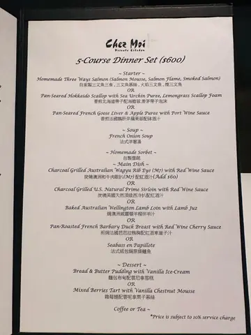 今夜與老友相約到Chez Moi晚餐,一進餐廳已看見低調奢華的裝潢配上柔和燈光,播着浪漫法國歌,未開餐已被這份雅致氛圍所打動。法國餐最講究擺盤,這家完全做到,每道菜式真係精緻到不得了。5-Course Dinner Set ($600位)🌟首先蒜香撲鼻的法包揭開序幕,外表酥脆內部柔軟。接着是頭盤,🌟自家製三文魚三食,三文魚慕絲,絲般柔滑,魚味濃郁火焰三文魚,煙三文魚,極度鮮嫩,煙熏味濃厚。🌟香煎北海道帶子配海膽蓉、香茅帶子泡沫。帶子焦香彈牙,海膽蓉甘香,香茅帶子泡沫口感以忌廉奶油 ,細緻順滑,頂級好味道。接著到湯品🌟經典法式洋蔥湯整碗盛載滿滿洋蔥絲,濃郁的洋蔥甜味配上法包和融化的芝士,是法國菜的comfort food代表。主菜前來一道🌟自製雪葩清清口,清新檸檬味,酸酸甜甜,讓人以最佳狀態迎接重頭戲。🌟焗澳洲威靈頓羊柳則以酥皮包裹,金黃酥脆的外層下藏著鮮嫩的羊柳。羊肉本身的臊香風味被完美保留,配上醬汁與甘筍醬,味覺十分滿足。🌟法式紙包焗原條鱸魚,整條鱸魚連同香草、檸檬片、白酒等配料密封於烘焙紙中烘熟,保留了魚的水分和鮮味,同時讓各種配料香氣充分融入魚肉,食落非常嫩滑鮮甜。到甜品上場😋🍨麵包布甸配雲尼拿雪糕暖暖的麵包布甸,口感綿密,帶有淡淡肉桂與焦糖香甜,搭配雲呢拿雪糕,冷熱交織的溫度帶來驚喜。🍧雜莓撻配雲呢拿栗子慕絲這款擺盤精緻優雅的法式甜品,視覺和味覺都令人驚鹽,牛油香的撻皮承載着色彩鮮艷的雜莓,每口都酸甜滋味,配上輕盈綿滑雲呢拿栗子慕絲,展現了甜點師傅的精湛手藝。最後coffee or tea 完結這餐法式五道菜,超滿足🥰…查看更多