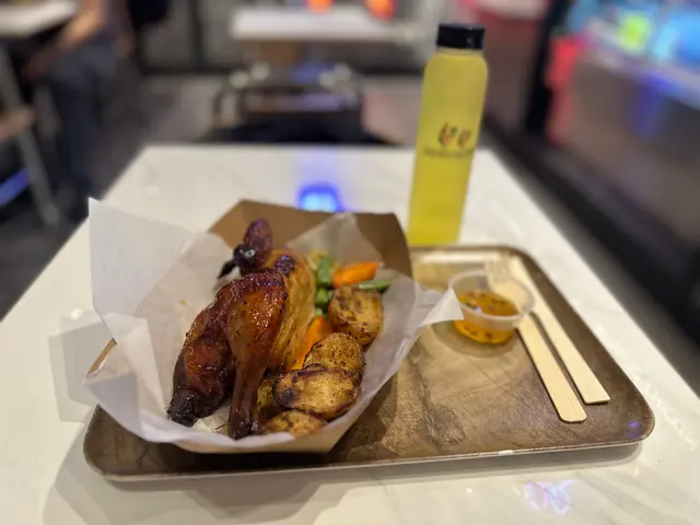 百香果蜂蜜烤雞餐半隻$59~大概等了10分鐘,已經有得食。由於選擇配菜時,有焗薯5小塊,想要求加配茄汁,原來這裡加醬汁每款多收一元,慳家為大前提,套餐以百里香蜜糖為主題,就跟規矩撘上,百里香蜜糖頗甜,酸酸甜甜,相信小朋友會較為喜歡。