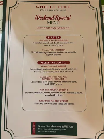 又再來海邊食東南亞菜,Chilli Lime食過唔錯,星期一至四有Weekdays 特別優惠,更抵食。買二個主菜免費送一個頭盤,仲有Add on 優惠,真係好抵食。💞(主菜) 泰式香茅黑椒燒雞 半隻份量都唔少,食得出香茅薰香,烤得嫩滑惹味。💞(主菜) 菠蘿海鮮炒飯融合了甜、酸、鹹,新鮮菠蘿的酸味能夠平衡炒飯的油膩感。炒飯的米粒外焦內軟,搭配菠蘿的脆嫩與海鮮的彈性,讓每一口都充滿驚喜。💞(送頭盤) 冬蔭公湯 Prawn 蝦係我食過最好飲嘅冬陰功湯,香料食材非常多,小辣,大頭蝦都好彈牙多蝦膏。💞 Naan 烤餅(蒜蓉)必吃,點咖喱簡直係絕配,今次冇點咖喱,淨食Naan都好好食,食晒。💞 飲品點了Virgin Mojito, Yellow Sky,@$38真心唔錯抵飲。💞大蝦柚子沙律好清爽,酸酸甜甜,作為前菜開胃好合適。餐廳好有氣氛,令人覺得休閑放鬆,有室內同埋室外位置,好chill,餐廳長備有蚊怕水,春夏天有蚊都唔怕。…查看更多