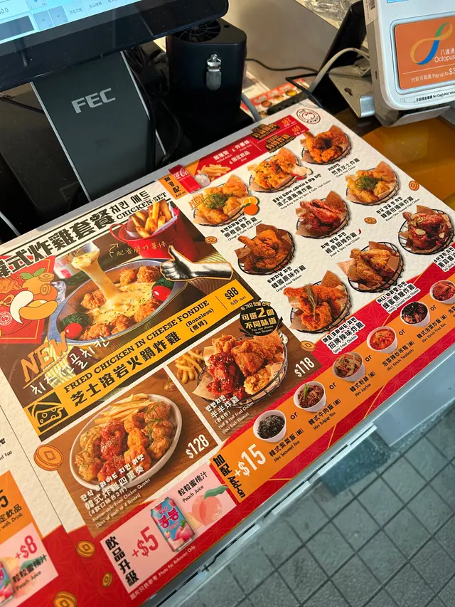 炸雞有十幾款不同口味選擇飯、麵、炒年糕等主食都有,價位親民坐喺窗邊係可以有海景!可以一邊欣賞海景一邊食炸雞🍗Chill爆~💫閃亮芝士炸雞6件都大大件,全部已去骨,雞皮個脆漿又薄又脆,雞肉有肉汁,鋪滿芝士粉,完美覆蓋炸雞🧀好味!套餐跟炸薯條,粗身直長,新鮮炸起脆卜卜💫韓國全州口味醬油豬手蛋蓋飯豬手塊塊都軟腍又彈牙,每啖都充滿骨膠原精華🤩醬油好濃稠,少少甜甜地好惹味;厚厚滑蛋滑溜富蛋香,多汁creamy,撈飯一流