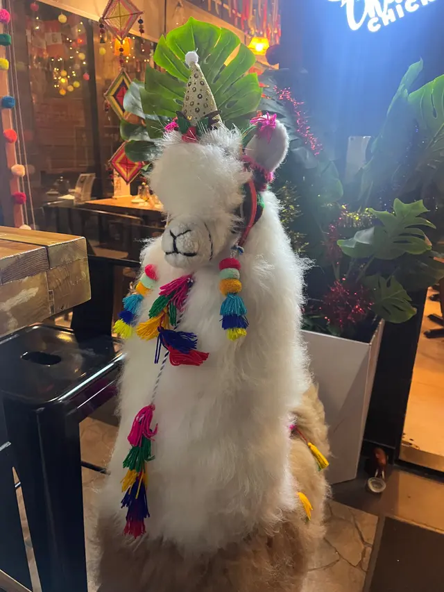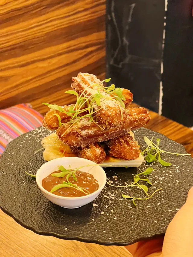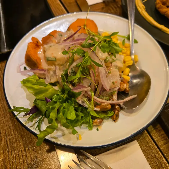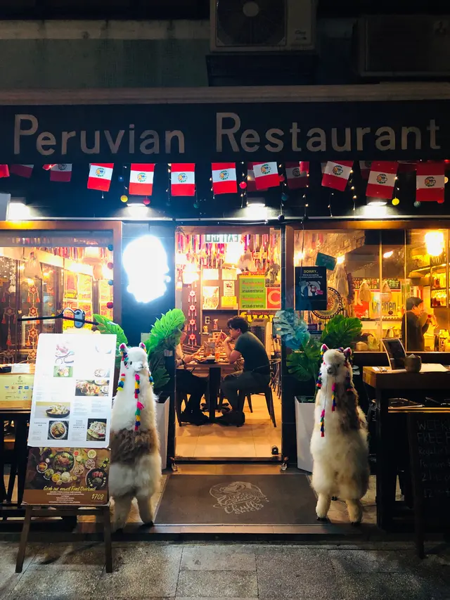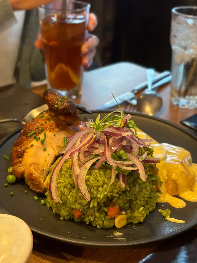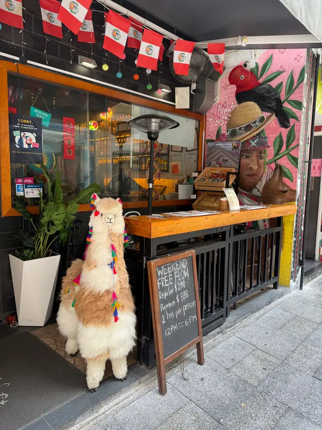這次我點了三道完美展現秘魯菜的酸辣鮮香既菜式🥑Pulpo AI Olivo 牛油果烤章魚(或類似海鮮),搭配綠色醬汁、洋蔥和紅椒碎,旁邊有半個萊姆和一堆酥脆的玉米片(可能是秘魯風味的 cancha 或類似炸玉米片)。這道菜風格鮮明,帶有海鮮與辛香料的結合。🐙Peruvian Grill 呢個係秘魯signature 菜式包含一塊烤牛排,雞肉,表面塗有秘魯風味的 chimichurri 或 ají 醬。下方有勁多薯條和新鮮沙律,沙律裡有粟米和紫洋蔥,淋上醋醬。整體呈現出豐富的南美風味,適合搭配啤酒或雞尾酒。🍨甜品 Chocolate Rice Pudding 巧克力飯後甜點外觀誘人,奶香濃郁,巧克力味平衡甜美,米粒柔嫩帶嚼勁,香料增添溫暖感。外觀精緻,口感舒適,味道溫馨,完美適合飯後享受。秘魯風味用煉乳提濃,暗藏肉桂與可可香,地道安第斯風情。🍸飲品 Drinks 精心製作的拿鐵咖啡,奶泡上有心形拉花。適合唔飲凍飲既人☺️Cusqueña Golden Lager 啤酒這是一款來自秘魯的知名啤酒,與秘魯菜搭配非常合適。💁♀️服務我們坐到靠窗戶外位,望著街景邊吃邊聊,氣氛超 chill。服務員熱情親切,英文流利,還主動幫忙拍照。從點餐到上菜只需 15 分鐘,效率一流。音樂播放拉丁輕快曲,增添異國情調。✨環境餐廳環境充滿南美風情:彩色壁畫、羊駝公仔和國旗裝飾,吊燈由竹編製,讓人彷彿置身利馬街頭。座位輕鬆隨性,營造出熱情又活潑的氛圍,背景有酒瓶和裝飾品,顯然是一家注重文化特色的餐廳。適合午餐快閃或晚餐聚會! 總結