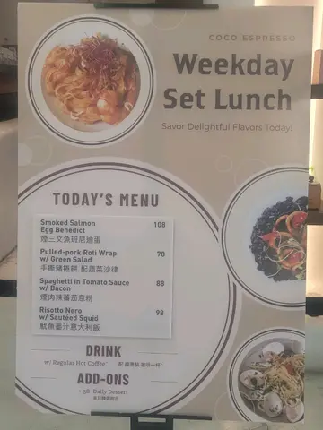 這間<COCO ESPRESSO>的食物食物在Open rice看着不錯,於是今天來了大埔這間試試,怎知,一試真是令人太失望了,吃完非常失落,因為質素很差:首先1)黑松露雜菌雲吞太鹹,醬料太多,雲吞口感差,似食麵粉,於是同職員反應,希望她回應的是:好,我同廚房反應下;可惜,得到的答案是:有黑松露,係咁㗎。但是,我吃過那麼多黑松露食物都不及它那麽鹹,職員態度给人不會接受意見和改進!2)All breakfast沙律菜和牛油果都不新鲜,牛油果有啡邊,唔靚,沙律菜苦苦地3)Latte非常苦,奶少,唔好飲所以,不建議去試!…查看更多