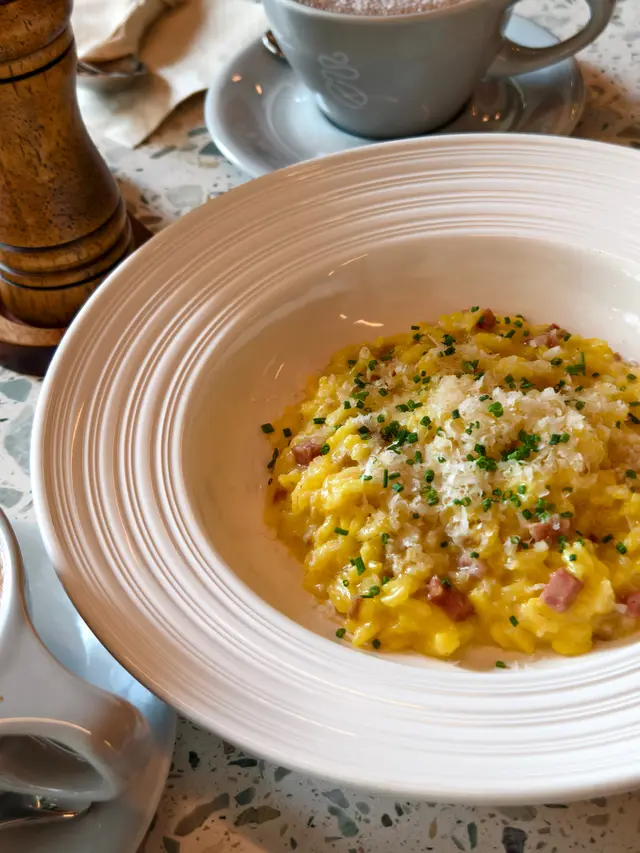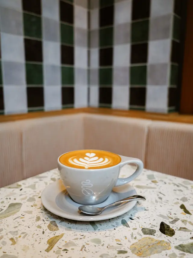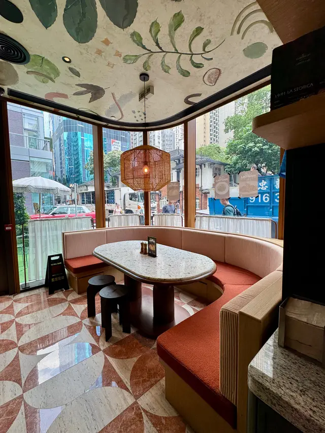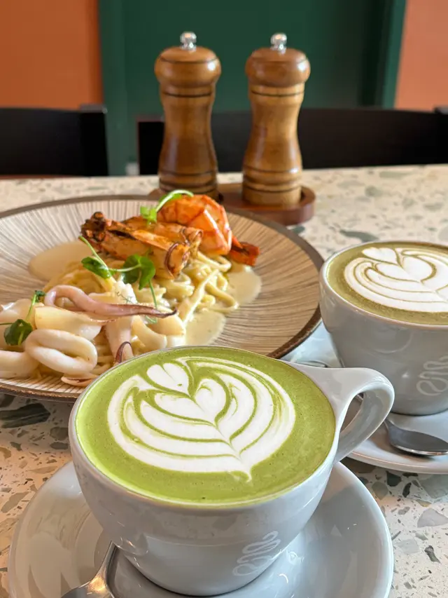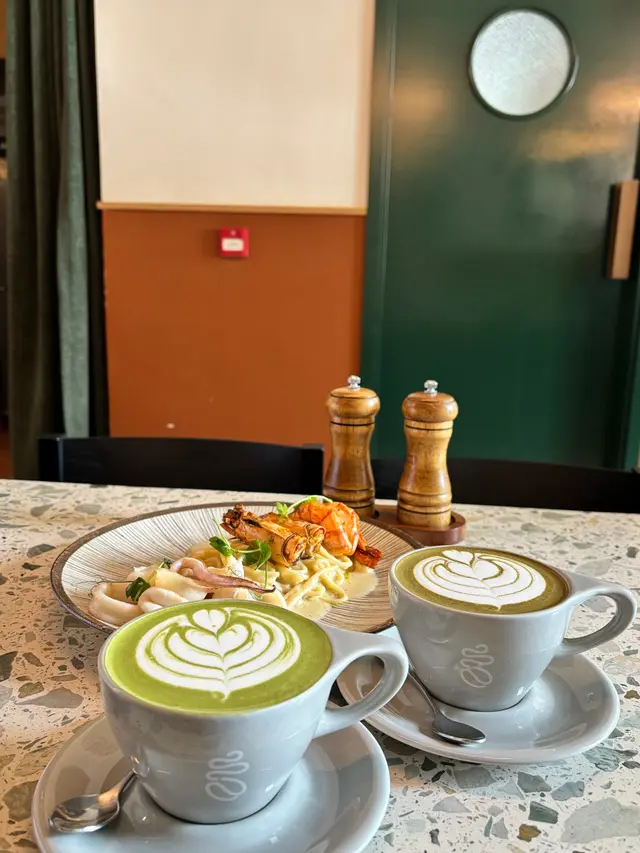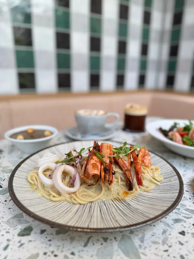 上次到訪中環陸海通大廈一樓新分店,今次再訪炮台山分店,呢間比中環空間更大,大部份座位都有自然光(原相直出),仲有室內外座位,裝修亦以意式復古風設計,簡單而優雅。食物方面,有早餐、三文治餐、烘焙包點套餐、沙律餐、午餐,呢間夜晚仲有Freeflow $198。🍝 Seafood Spaghetti with butter, anchovies sauce, prawns and squid $168 ~ 地中海鯷魚醬意粉配大蝦及魷魚,鯷魚醬帶來濃郁的海鮮風味,與意粉完美融合。🍄a small Truffle Mushroom Soup~ 松露蘑菇湯,搭配烤麵包,更加豐富。☕️Latte ~ 靚靚嘅馬圖案拉花,令人賞心悅目。
