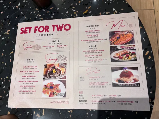 琴日收工同男朋友去旺角食飯,行街見到呢間餐廳個menu都幾啱食,就入去試一試~位置都闊落,坐得舒服我今次就嗌咗個二人餐,另外仲有alcohol menu冇影低揀左一個湯一個沙律,龍蝦湯都唔錯~要讚下附送嘅沙律都唔會hea你!落左牛油果同埋特調嘅醬汁,好開胃松葉蟹膏味噌甲羅燒配多士蟹膏非常多😋夠你搽滿哂4塊多士🤣多士都烘得好香口香草蕃茄醬肉丸呢個肉丸好特別,唔似平時食嗰啲咁鬆散,呢個好彈牙😋芝士又會中和咗蕃茄醬嘅鹹味,未到剛剛好Aomori Daiquiri呢杯係青蘋果+rum+山椒嘅cocktail, 溫馨提示下呢杯嘢係辣嘅!食得辣嘅人先試呀!Komorebi呢杯係柚子酒+蜜糖+gin, 上面嗰塊餅乾仲係店舖自家製嘅,呢杯酒好香甜易入口,好飲!阿根廷紅蝦蟹肉波浪意粉啲蝦好新鮮!個醬汁應該仲落左鹹蛋黃,每條意粉都掛到啲醬汁,好惹味😋食到後面覺得有啲漏嘅話,可以加隔籬個稀啲嘅醬汁撈下佢美國和牛肩胛牛肉味好重,肉質好軟熟😋最欣賞個醬汁,落左少少花椒,但唔會太辣,反而有啲麻香味好正tiramisu波波造型好可愛😆咖啡味都好濃,一切開個手指餅係爆汁架!我地兩個人食左$834,食得非常飽!呢個價錢食得咁飽又有酒飲,我覺得都唔錯😋推薦俾大家!…查看更多
