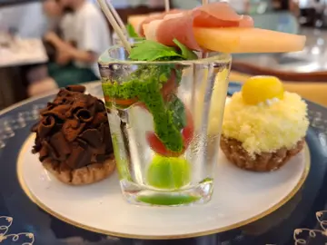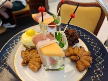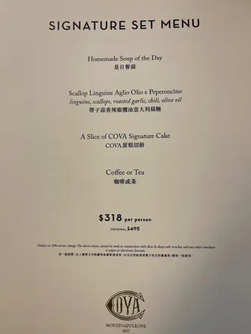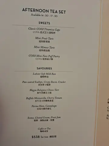 因為妹妹有2張COUPON,所以到COVA 來個下午茶。在商場的餐廳就座後,就要做最重要的事:落單。左右計算後,選擇了雙人下午茶。三層架,保證可以嚐到多款的小食&甜品,可以解決選擇困難症。小食Buffalo Mozzarella, Cherry Tomato 水牛芝士伴櫻桃蕃茄 很正常的紅白青的組合,Parma Ham, Cantaloupe巴馬火腿伴蜜瓜鹹點Lobster Soft Milk Bun龍蝦軟包 包包軟身有如Brioche,小小的龍蝦肉帶著海水鹹味,跟微甜Brioche很和諧。Pan-seared Scallops, Crispy Bacon, Cracker香煎帶子脆餅 帶子鮮甜, 但無驚喜 Wagyu Bolognese Cheese Tarts和牛肉芝士撻 有牛肉味和芝士味, 但無驚喜Scones, Clotted Cream, Fruit Jam 鬆餅 凝脂忌廉 果醬 很慶幸Clotted Cream是帶黃調, 並非那種藍調的Cream。 SCONE鬆軟不太硬,容易掰開,在半邊SCONE塗上CREAM後再上藍莓JAM。Cream不油膩,藍莓JAM不太甜,剛好襯托出Scone的原味。Mini Fruit Tars迷你蘚果撻 有2款水果。 撻的中芯位也充滿著CREAM CREAM。Mini Mimose Tars迷你甜品撻 有2款, 深啡色是朱古力,白色卻猜不到。COVA Mini Fans Puffs Pastry 迷你扇子酥 乾身酥皮脆脆,忍不住加上SCONE的奶油, 濕潤濕潤一下。Classic COVA Tiramisu Cup COVA意式芝士蛋糕杯 Tiramisu酒味不太濃, 微甜不太膩,享用過後不會頂肚。Americano Black Coffee 享用多款含有高糖高脂肪及大量精緻澱粉的甜品,要來一杯無糖無奶的BLACK COFFEE,感覺較健康。 扣減2張COUPON後, 每人仍需要支付近2百蚊。 幸好有COUPON。