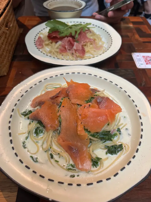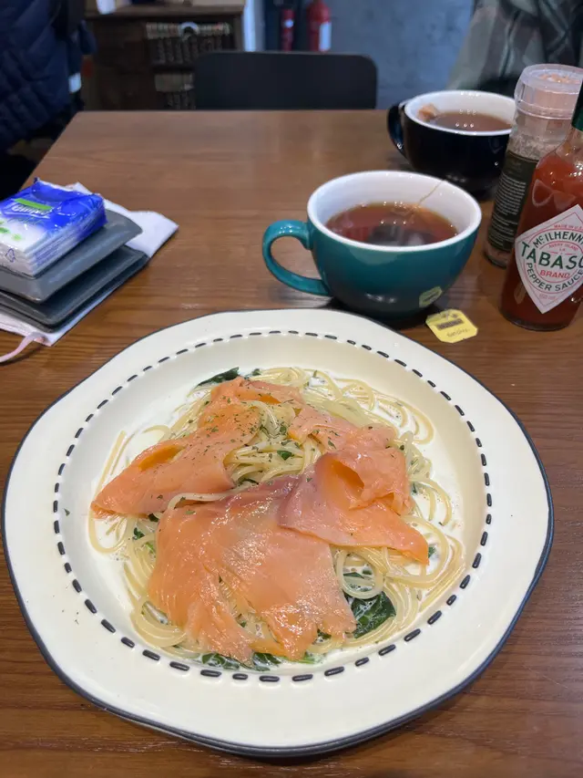 今日去開石門,朋友話bookmark左呢間cafe好耐,做完野差唔多十二點去試一試。去到都80% full, 我地三個人得返一張二人枱,店員都幫我地問其他客人搬一搬位俾張角落L形枱我地三個人坐。cafe入面有個mon影住出面俾人睇住架車都幾貼心。飲品同食物都來得超快! 叫食物嘅話飲品仲有得用跟餐價。朋友叫嘅明太子雞肉意粉。意粉睇到係煮得較硬身唔會太軟。deluxe all day breakfast 可以揀麥包/牛角包/scone. 仲有紅色火龍果超有誠意! 薯仔沙律調味非常好,火腿都唔係普通茶餐廳火腿 (本身睇到menu仲諗住走火腿) 食落好有驚喜!有機會再去石門會再幫襯!…查看更多