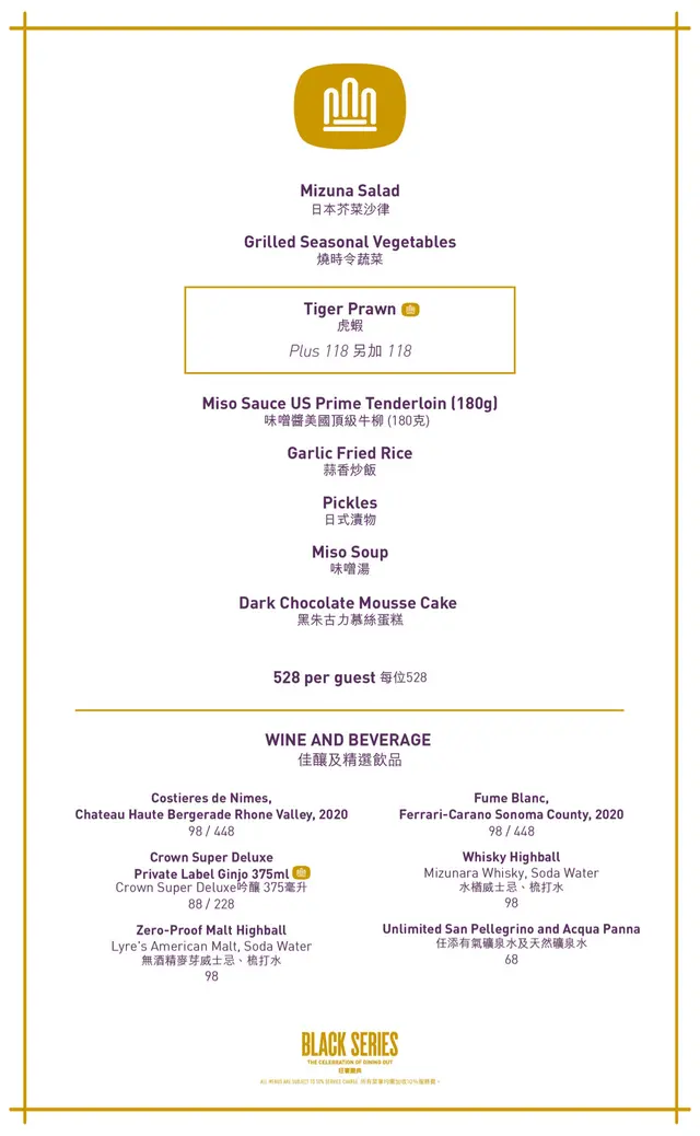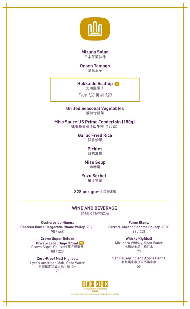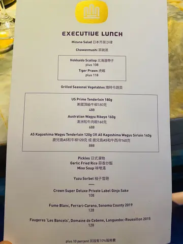 Nestled in the heart of Central, Crown Super Deluxe promises a dining experience that tantalizes the taste buds and elevates the senses. I was eager to see if the restaurant's culinary offerings lived up to its sterling reputation.StartersOur meal commenced with the Mizuna Salad, a delightful and crisp starter that set a light and refreshing tone for the courses ahead. The greens were vibrant and fresh, dressed with a subtle vinaigrette that enhanced their natural flavors without overpowering them.Adding a touch of indulgence, we opted for the Hokkaido Scallop (at extra price). The scallop was expertly seared, boasting a perfect balance of sweetness and salinity. Its tender, melt-in-the-mouth texture underscored the quality of the seafood and the skill in its preparation.Main CourseFor the main event, I selected the Australian Wagyu Ribeye, a 140-gram cut of beef that did not disappoint. Cooked to perfection, the ribeye was rich and buttery, with a marbling that provided a luxurious, melt-in-the-mouth experience. The subtle seasoning allowed the natural flavors of the Wagyu to shine, making each bite a testament to its superior quality.The Grilled Seasonal Vegetables served alongside were a delightful accompaniment. They were charred to perfection, adding a smoky depth that balanced the richness of the ribeye beautifully.SidesThe Garlic Fried Rice was an aromatic and flavorful addition to the meal. Each grain was infused with a delicate garlic essence, providing a satisfying and fragrant complement to the main dishes.The Miso Soup was a comforting classic, offering a warm, umami-rich broth that soothed the palate. The accompanying Pickles provided a tangy and refreshing contrast, serving as an effective palate cleanser.DessertTo round off the meal, we enjoyed the Yuzu Sorbet, a light and refreshing dessert that provided a perfect end to the lunch. The sorbet's tangy and slightly sweet notes of yuzu cleansed the palate, leaving a lingering sense of freshness.BeveragesWhile we did not sample the Crown Super Deluxe Private Label Ginjo Sake, the wine selections on offer were tempting. The Fume Blanc from Ferrari-Carano, Sonoma County 2019 and the Costieres de Nimes from Chateau Haute Bergerade, Rhone Valley 2020 both appeared to be excellent choices to enhance the meal.Overall ExperienceOur dining experience at Crown Super Deluxe was nothing short of exceptional. The menu is a carefully curated selection that showcases the restaurant's commitment to quality and culinary excellence. Each dish was crafted with meticulous attention to detail, from the fresh and vibrant starters to the indulgent main course and refreshing dessert.Crown Super Deluxe in Central offers a dining experience that is well worth the visit, promising a culinary journey that delights and satisfies the senses. Whether you're seeking a sophisticated lunch or an indulgent treat, this establishment delivers a memorable and luxurious dining experience.…查看更多
