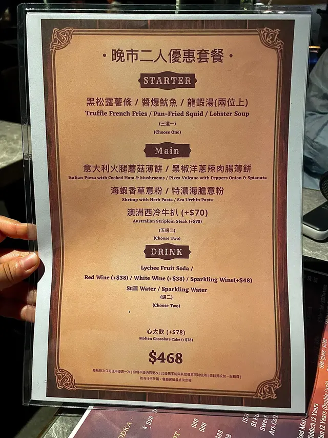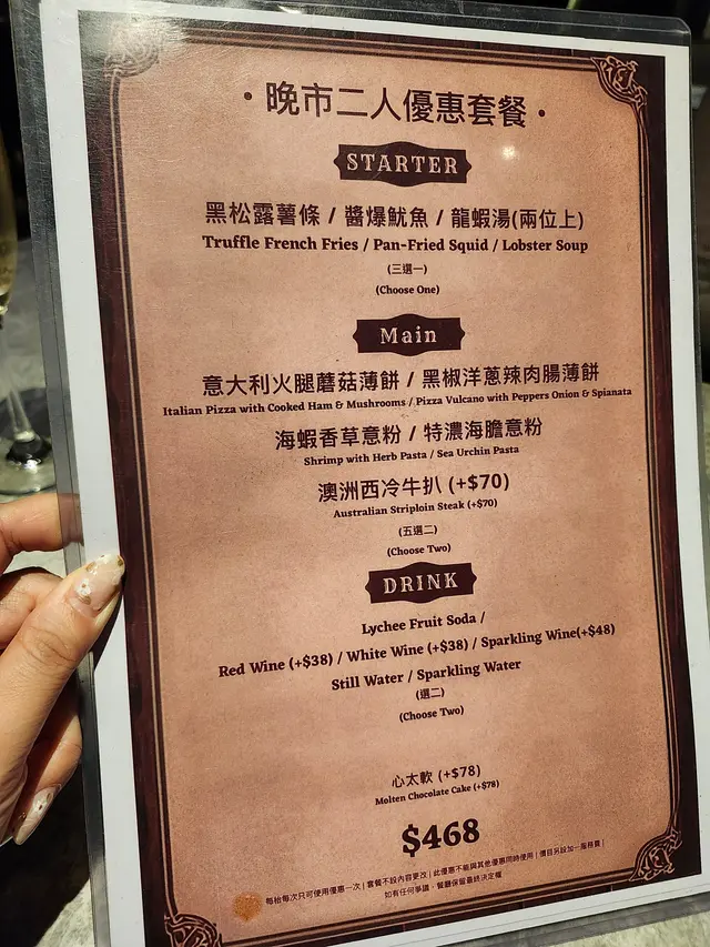 同朋友食飯敘舊,諗住搵間樓上餐廳舒舒服服食餐飯,就咁啱搵到呢間,見到個晚市二人優惠套餐,好似ok,就即刻叫咗黎試下。🟡 黑松露薯條呢個我每次見到都必叫,因為我好鍾意食薯條😂😂薯條夠晒新鮮熱辣又大條,配埋個truffle mayo都好正。🟢 意大利火腿蘑菇薄餅因為好想食pizza所以就叫咗,Pizza餅皮外面鬆脆內裡煙韌,芝士、火腿同蘑菇呢個配搭真係冇得輸,而且食落口唔會太大負擔,我同朋友都好鍾意。🟣澳洲西冷牛扒食西餐既時候總係好想食牛,所以我地加左錢叫左呢個牛扒,真係煎得啱啱好,夠晒juicy而且又好軟淋,就咁食+點醬都好唔錯!🟤荔枝梳打我同朋友咁岩都唔係幾舒服冇飲到酒,揀左呢杯荔枝梳打,荔枝味幾香,又夠甜,飲落去真係幾fresh,幾好飲☺️…查看更多