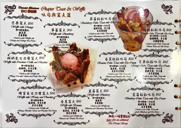 呢間小店都幾親切,一坐低店員介紹餐牌有鹹食餐牌同甜品餐牌,估唔到都幾多甜品食!除左西式各款甜品,芭菲杯、楊枝甘露、榴槤系列、香蕉船、奶凍、班戟、窩夫、沙冰,中式嘅糖水都有⭐️🍦🍧🍨🎂🍰🧁🍮🥣🍹雪糕選擇都估佢唔到勁多味揀喎!雲呢拿、朱古力、綠茶、曲奇、芒果、草莓、榴槤、香芋、熱情果、椰子、蜜桃、荔枝、海鹽。🍪🍫🍵🥭🍓🍑🥥貴族三重奏 $75三重奏,有焦糖布甸、朱古力心太軟、雪糕。焦糖布甸頂部一層薄薄的焦糖殼,做得不錯!顏色金黃、口感香脆。篤破焦糖層,下面既布甸都叫奶香味濃郁,口感絲滑細膩。朱古力心太軟外層烘焙得剛剛好,外層輕脆,上面仲有啲脆脆,口感升華,液態巧克力爆漿,味道亦剛剛好,唔會太甜。配埋冰凍既雪糕,冷熱交替,三重奏味覺體驗豐富。炸蝦粟米紫菜烏冬豬骨湯底 $38另外仲叫左個烏冬食下。炸蝦分開上,咁就唔會淋,好細心。價錢好親民!整體黎講,呢間小店無論鹹食、甜品都選擇多樣化,總有一樣啱。下次經過大角咀,可以一試黎體驗下親民價格既小吃甜品。
