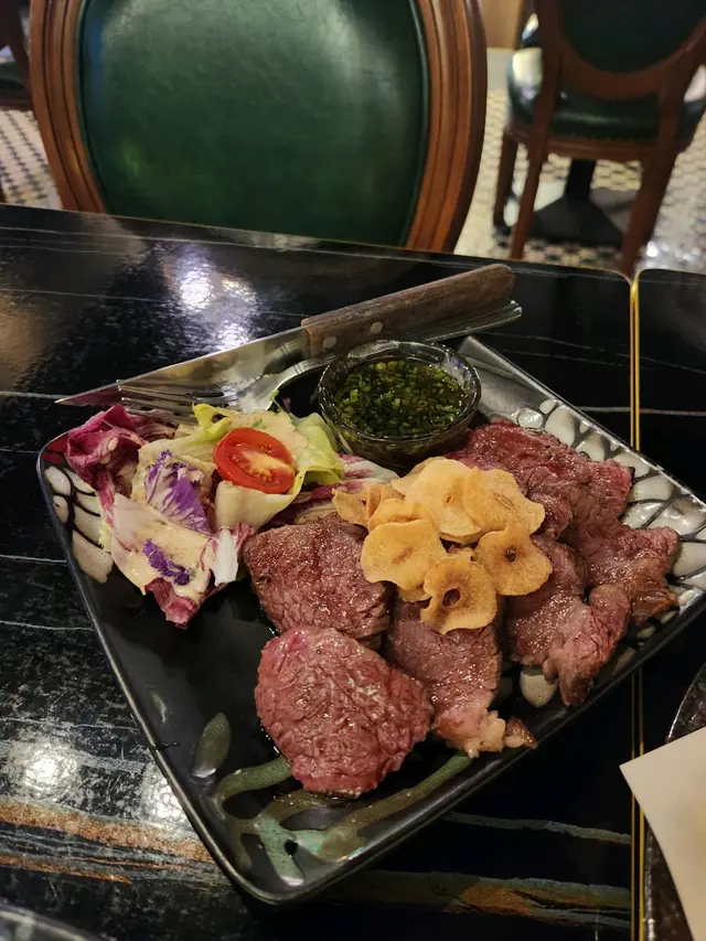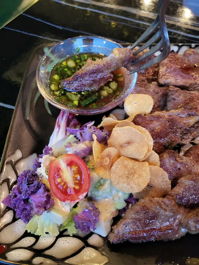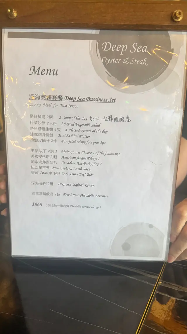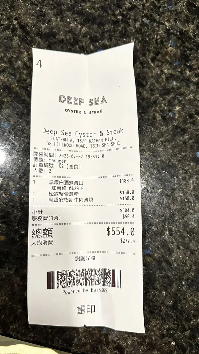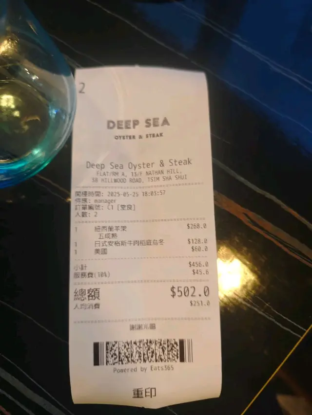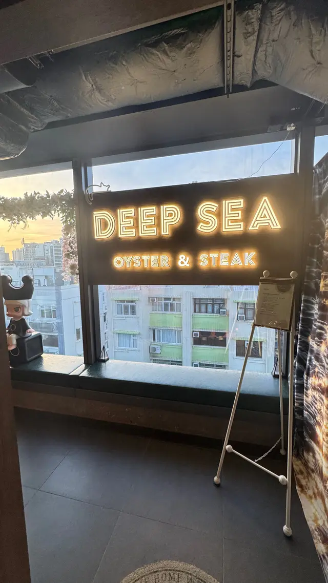 今次嚟到位於尖沙咀山林道嘅Deep Sea Oyster & Steak,提供多國菜菜式同埋以生蠔主題餐廳,每日精選各國時令新鮮肥美嘅生蠔,另外供應多款海鮮菜式、日式刺身、沙律、鐵板菜式同埋意粉等。餐廳位於商業大廈高層,可以欣賞到窗外美景,餐廳裝潢浪漫優雅,好適合喺度晚餐。今次晚餐揀咗深海精選套餐,有沙律前菜、餐湯、生蠔、大蝦同埋主菜,性價比高。什菜沙律前菜沙律菜新鮮,口感爽脆,加上蕃茄仔,非常開胃。是日餐湯是日餐湯係三文魚湯,三文魚湯味道鮮甜,魚味濃郁,帶有香濃白胡椒味。是日精選生蠔2隻每日精選各國時令新鮮肥美嘅生蠔,今次精選係西班牙Arrousa同埋法國Mont Blanc生蠔。西班牙Arrousa生蠔,口感順滑爽脆,飽滿鮮甜;法國Mont Blanc生蠔肉質豐滿,味道鮮甜,帶濃厚嘅海水味。牛油煎大蝦2隻牛油煎大蝦,大蝦口感爽彈,肉質鮮嫩多汁,牛油味香濃,簡單加上檸檬汁點綴,味道更為清新。美國安格斯肉眼主菜美國安格斯肉眼牛扒,點咗五成熟,生熟程度啱啱好,牛扒外焦內嫩有肉汁,牛味濃郁,牛扒上嘅炸蒜片炸至金黃酥脆,帶有濃郁嘅蒜香。…查看更多