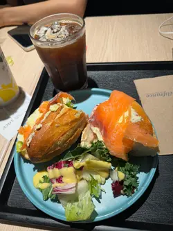 落機經過見到呢間Cafe環境幾舒服☕,就入去試咗呢個三文魚法包餐🥖🐟。餐點一上枱賣相幾靚,法包金黃微脆,加埋大片煙三文魚睇落幾吸引✨。不過入口就有啲失望,法包偏硬而且有啲乾,咬落去唔太易開,入面嘅三文魚份量唔少但味道淡淡地,冇乜鮮味,醬汁又唔太突出🥲。沙律方面,菜都算新鮮,不過個醬偏重口,食幾啖就覺得有啲膩。配埋嘅凍咖啡☕味道正常,唔算香濃但勝在夠冰凍,食完都算清一清味。整體嚟講,呢個餐賣相比味道出色多啲😅,食得飽但唔算特別滿足,如果純粹想坐低hea下飲杯嘢都可以一試。