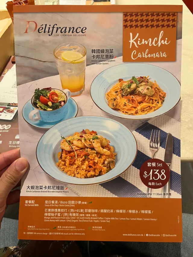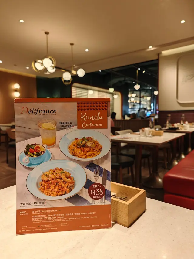 早前與居住在屯門的朋友gathering,朋友帶我到Delifrance用餐,說那裡環境氣氛不俗,食物亦頗有水準,令我都幾期待!!餐廳樓底相當高,空間感十足,配上柔和燈光,頗有情調,很適合與朋友/ 情人慢慢用餐~來到餐廳時已經是下午2時多,我們先選了一客午餐享用,再另叫了2客下午茶餐share!!友人本想叫期間限定的流心布袋芝士系列,但原來已經暫停供應,故選了別的午餐~大蝦羅勒青醬意粉 (跟餐配熱飲) (凍飲另加$5) ($104)這客意粉顏色配搭相當出色,除了有4隻爽口大蝦,還有酸甜的車厘茄以及菇菌,意粉亦很有嚼勁,調味亦合宜,個人覺得相當好吃!炸阿拉斯加魚柳配薯條 ($72) (下午茶餐)炸得金黃香脆的阿拉斯加魚柳,外脆內嫩,配以香脆熱辣的薯條,喜歡吃炸物的我很滿意呢~法式丹麥吐司配鮮果及雪糕($59) (下午茶餐)一客三件的丹麥吐司,酥脆又富牛油香,配搭蜜糖更為美味; 當然不能錯過幼滑的雲呢嗱雪糕,為這客吐司更添色彩!凍檸檬柚子蜜 (跟餐加$5)酸甜又透心涼的柚子蜜,實在有助消膩呢!P.S. 結帳時見到原來餐廳推出Cuisine Rewards 全新會員計劃…查看更多