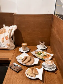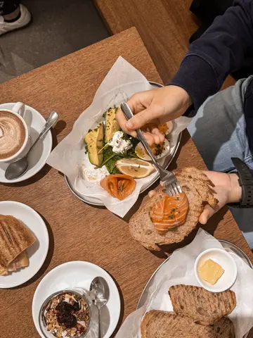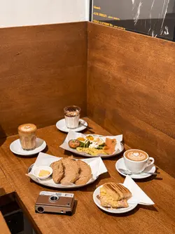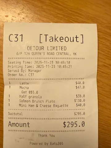 說起來蠻慚愧 ~ detour 開到第三間分店這次才是我第一次到訪 detour 之前路過西環跟上環兩間店都是滿的不久前聽說在中環開第三間了 馬上安排三間 detour 的裝潢風格其實都蠻相似中環店面積小小 木質桌椅擺放得較密麻周遭放著咖啡和電影有關的書本海報復古和現代感氛圍並存餐點主打 open sandwichs 跟 brunch plate最欣喜的是吐司類可以點半份連乳酪也可以點小份的適合小鳥胃 或是每款都想點的貪心鬼𓋪 ᴅᴇᴛᴏᴜʀ ɢʀᴀɴᴏʟᴀ (ʜᴀʟғ)𓋪 ʜᴀᴍ ᴄʜᴇᴇsᴇ & ᴛᴏᴍᴀᴛᴏ ʙᴀɢᴜᴇᴛᴛᴇ (ᴍɪɴɪ)𓋪 sᴍᴏᴋᴇᴅ sᴀʟᴍᴏɴ ʙʀᴜɴᴄʜ ᴘʟᴀᴛᴇ𓎺 ʟᴀᴛᴛᴇ𓎺 ᴍᴏᴄʜᴀ (ᴏᴀᴛ ᴍɪʟᴋ)早餐我很喜歡點的健康乳酪 半杯也不小希臘乳酪 雜莓漬醬配香脆自家製 granola外酥脆內軟綿的 baguette夾著常見的 火腿 芝士 番茄也增加了層次點半份很剛好 因為要留肚享用期待的 brunch plate早午餐盤會分開熱食跟麵包兩盤上桌有鹹香煙三文魚 搭配牛油果 日式半熟蛋跟番茄 隨意放上有嚼勁又有飽足感的 sourdough 上色彩美美又營養均衡 看著就很賞心悅目拿鐵口感順滑柔和 雖然拉花很快就消失友人則點了燕麥奶摩卡 可可香氣配微微甘苦平常不太喝咖啡的友人默默喝了整杯 他們也是少數開超級早的 cafe 無論是享用超早的早餐還是慵懶的早午餐週末也很適合在這裡享受悠閒時光…查看更多