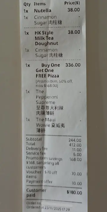 外賣平台 X Dough Bros 推出限時優惠,指定薄餅買一送一,只要 $168 就有兩個10吋大嘅手工酸種薄餅。咁啱去朋友屋企打牌,咁就啱哂嘞。指定薄餅有四款可揀:意大利辣肉腸薄餅、夏威夷薄餅、燒烤醬雞肉薄餅、黑松露薄餅。揀咗前者兩款。意大利辣肉腸薄餅:10" pizza 開六件,都有番咁上下大細。辣肉腸份量都多,茄醬底及水牛芝士味濃,手工酸種餅底好有咬口。夏威夷薄餅:有火腿、脆皮腸、菠蘿,份量足,茄醬底及水牛芝士同樣味濃,手工酸種餅底𡁻勁一流。另外買多兩個爆醬冬甩,$38一個,有勁多醬可以揀,而且可選擇肉桂糖/白砂糖。Nutella 榛子可可醬:冬甩唔算好大個,同女士嘅拳頭差唔多。表面洒上大量肉桂糖,外層微脆,內裡十分鬆軟,中間唧咗不少醬,榛子可可醬味道濃,不錯。港式奶茶:港式奶茶醬味道唔太濃,比甜味冚哂啲味,麻麻。兩個薄餅 + 兩個冬甩,連埋其他手續費,又用埋啲優惠,都係$180,好抵食。
