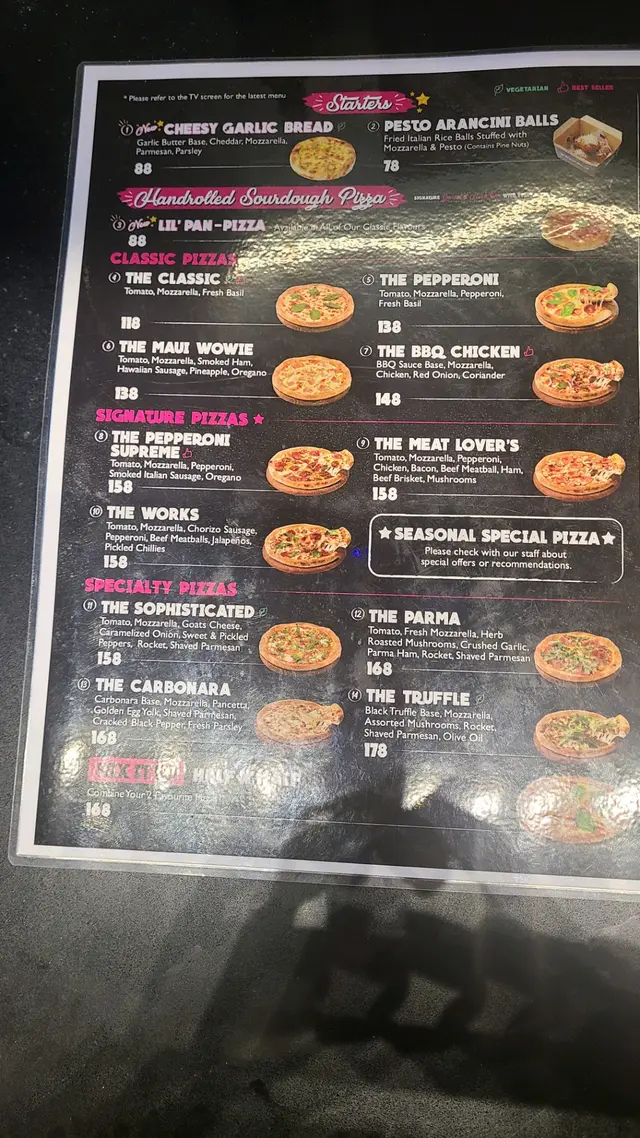 叫Pizza佢一定係三甲之內叫咗三款唔同嘅披薩。先講嗰個肉腸披薩,上面嘅肉腸切到一片片,size均勻,烤到微微焦香,咬落去肉汁豐富,搭配嘅芝士都拉絲拉到好似蜘蛛網咁,不過可能芝士放得有啲多,食多幾塊有啲膩。同其他餐廳嘅肉腸披薩比,呢度嘅肉腸味道算係比較濃郁嘅,但就冇乜特別嘅香料去提味,唔夠層次。再睇嗰個雞肉芝士披薩,雞肉嫩滑,芝士嘅奶香同雞肉嘅鮮味融合得幾好,上面嘅紫洋葱增添咗少少嘅爽脆口感同清甜,但係芝士嘅量相對肉腸披薩少咗啲,感覺冇咁豐富。同街邊嗰啲平價披薩店嘅雞肉披薩相比,呢度嘅雞肉質量明顯高好多,口感唔會柴。最後個火腿芝麻菜披薩,火腿鹹香適中,芝麻菜新鮮爽脆,帶住少少嘅苦味,中和咗火腿嘅鹹味,幾開胃。不過芝麻菜有時會有啲老,咬落去有啲韌。同之前食過嘅意大利餐廳嘅火腿披薩比,呢度嘅火腿質感稍遜一籌,但價錢就親民好多。總體嚟講,呢間餐廳嘅披薩都有自己嘅特色,雖然有啲小瑕疵,但係味道都算唔錯,價錢方面都算合理,值得一試。