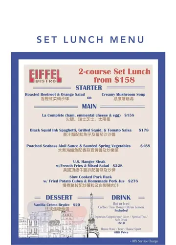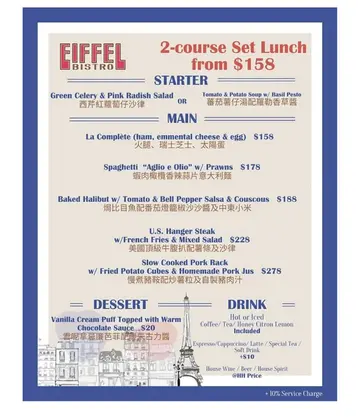 老公想吃法餐,我們也想看電影,所以我們決定去太古城。環顧四周,發現了這家Eiffel Bistro我們點了雞肉凱薩沙拉和藜麥沙拉作為開胃菜,還點了一份鰈魚和一些薯條作為主菜。凱薩雞肉配上長葉生菜、番茄和帕瑪森起司。藜麥沙拉配有鮪魚、松子、葡萄乾和石榴。鰈目魚佐青花菜、馬鈴薯和檸檬蒜醬。所有的菜都很美味而且做得完美。工作人員非常友善和細心。他們甚至在房子裡提供了蘋果派,因為那天是我妻子的生日。這是一次美妙的經歷,因為我們喜歡這裡的食物和服務,我們一定會回來的。人均消費💰 : $ 150總結✍ : 會再黎 , 環境好食物好服務好🏠 Eiffel Bistro地址 : 太古太裕路5號興安閣地下G514號舖…查看更多