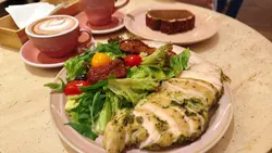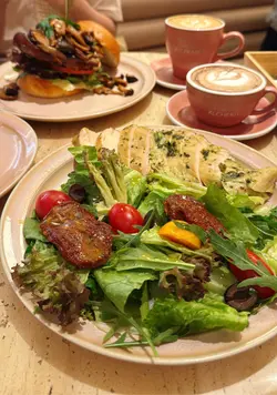 【將軍澳Popcorn商場Espresso Alchemy Cafe食評|粉紅夢幻咖啡廳の驚喜足料午餐】位於將軍澳Popcorn商場的Espresso Alchemy Cafe,以粉紅色為主調的裝修風格瞬間俘虜少女心,但令人驚喜的是這家咖啡廳不僅是「打卡勝地」,更在食物質素上展現十足誠意。這次中午到訪,特意試了兩款主打午餐,每份套餐均附飲品,整體體驗超出預期!◤ 青醬雞胸沙律配檸檬醋醬 $98 ◢一上桌即被超大份量震懾——滿滿的新鮮沙律菜堆成小山,絕對是連男生都能吃飽的誠意之作!雞胸肉處理得極其出色,切開後肉質呈現誘人的淡粉紅色,口感異常嫩滑,完全顛覆對雞胸「乾柴」的刻板印象。自製青醬香氣突出,搭配清爽的檸檬醋醬,既解膩又提鮮,絕對是健康飲食者與減肥人士的首選!◤ 雜菌豬頸肉漢堡配芥末籽醬 $130 ◢漢堡賣相精緻得讓人捨不得下手!厚切豬頸肉足足有1.CM厚,猶如日式豬扒,入口卻驚現彈牙爽口的質感,香氣撲鼻。最驚喜的是夾滿炒香的雜菌,香菇的鮮美汁液滲入肉中,搭配微甜的芥末籽醬,讓整體風味更立體。附餐的新鮮沙律菜,與漢堡形成完美搭配。◤ 飲品◢• Cappuccino:奶泡綿密如雲,咖啡醇香濃郁,拉花精緻持久• 熱朱古力:濃稠度恰到好處,可可香氣濃厚卻不甜膩,飲用特別暖心◤ 咖啡胡桃蛋糕 $34 ◢蛋糕體濕潤綿密,咖啡香與胡桃脆感交織,甜度控制得宜,每一口都吃得到烘烤堅果香,配咖啡簡直絕配!◤ 環境與細節 ◢店內粉紅色調營造出夢幻氛圍,絨面沙發與大理石餐桌處處可見設計巧思,連餐具都統一採用玫瑰金與粉系搭配,難怪成為女士們的熱門打卡點!雖然風格甜美,但食物份量與品質卻毫不馬虎,無論是姊妹聚會或獨自享受都很適合。整體評價:從視覺到味覺都充滿驚喜的咖啡廳,尤其推薦給注重食材品質又愛拍照的食客。雖然定價屬中上水平,但考慮到食材處理的細緻度與份量,絕對物有所值!下次定要再試其他手沖咖啡與甜品~…查看更多