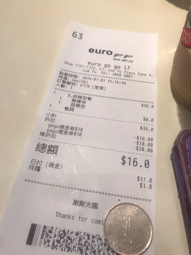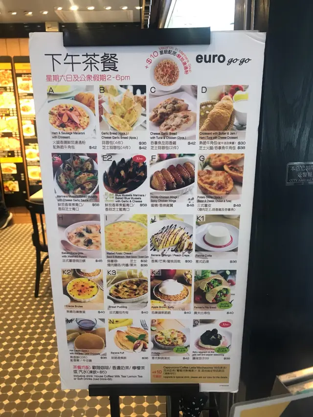 20190701 今日放假出去行街,經過樂富廣場見到有Eurogogo ,見到下午茶餐牌好吸引坐低叫個B餐(蒜蓉包+熱飲),$36 蒜蓉包熱辣辣,牛油味濃郁,蒜蓉一粒粒,好滋味熱檸茶 茶味好重30幾蚊 自己買完野食 有人送餐抵食 查看更多