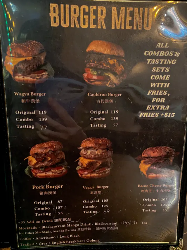 和朋友說起不如搞個讀書會📖(雖然只有我們兩個🤣),互相分享最近讀過的書,分享一下大家從中得著些什麼以及有怎樣的感受。真的很喜歡這樣的交流☺️,互相聆聽討論分享,增值知識與啟發思考🌟。然後我們就去了銅鑼灣一間靜靜的漢堡店,邊吃漢堡邊進行小小讀書會🤓。其實小餐店就在時代廣場旁邊,但這裡和那邊好像完全兩個世界 ── 一邊很幽靜,一邊很喧鬧。餐店裡面佈置復古,有點古堡感覺🏰,完全就是讀書會的氛圍😆。我們點了和牛漢堡與古代漢堡,加一個薯條,和兩杯 matcha latte。以我們點的兩款漢堡為例,有分:Original ($119)、Combo ($139)、Tasting ($77)。分別就是單點、跟薯條及漢堡轉細size。和牛漢堡牛味好濃😋,牛肉好厚,肉汁豐富。而古代漢堡特別在於它的醬汁。麵包好鬆軟挺身,兩個都好好食😋。而薯條沒特別,和麥當勞的很似😂。至於matcha latte ($45),奶味幾香,抹茶味可再加強。那晚整個店子只有我們,溫暖燈光中,歎著抹茶鮮奶,分享著書本字句,背景播著柔聲音樂,理想中的讀書會就是這般了🥰。臨走前,和歡樂的店員聊了幾句,伴著她熱情的大笑,說聲謝謝,晚安🌃。…查看更多