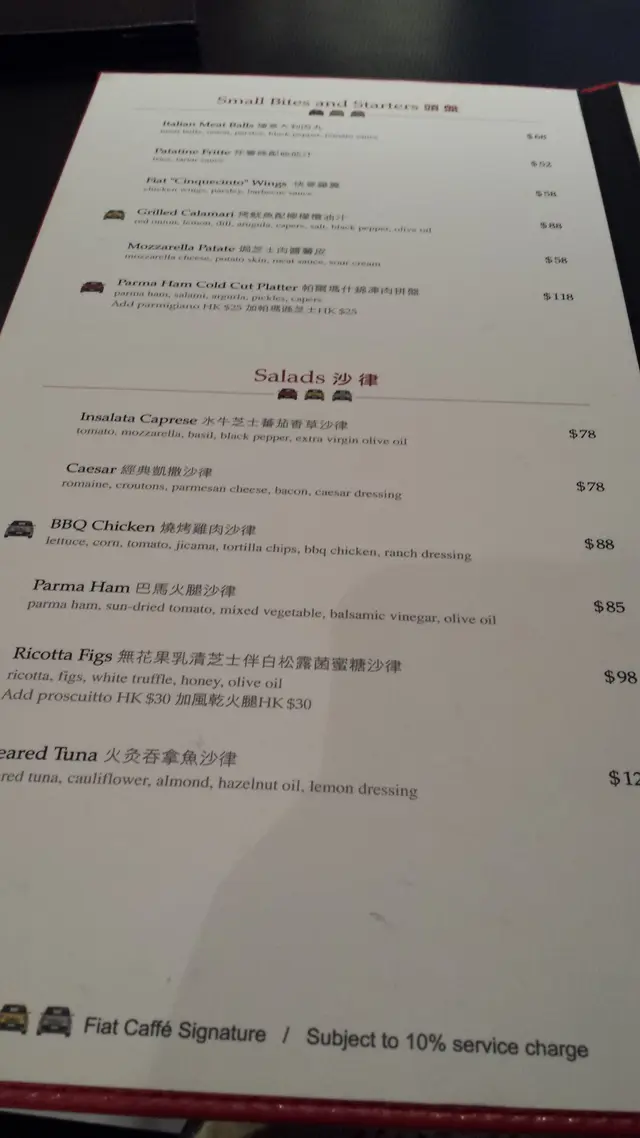店名:Fiat Caffe地址:銅鑼灣禮頓道77號禮頓中心G5-G6號舖好味指數:6/10價錢:$118帕爾瑪什錦凍肉拼盤整碟肉有12塊,個人覺得一般,味道有點咸,有幾分像臘腸的味道。伴碟沙律味道酸酸的,頗開胃,麵包較硬,很難咬開。店名:Fiat Caffe地址:銅鑼灣禮頓道77號禮頓中心G5-G6號舖好味指數:8/10價錢:$112卡邦尼意粉卡邦尼汁夠濃味juicy,均匀分佈在每一條意粉上。意粉爽囗,配料有煙肉,蘑菇,芝士,香草等,略嫌份量太少。店名:Fiat Caffe地址:銅鑼灣禮頓道77號禮頓中心G5-G6號舖好味指數:7/10價錢:$108燴意大利肉丸配米型意粉第一次接觸米型意粉,口感很特別。外貌有點像意大利飯,份量偏少。出乎意料之外,三粒尤如乒乓球大的肉丸份量相對足夠,肉質鮮味,而且味道亦不錯。而且蕃茄味道不會太酸,頗開胃。 …查看更多