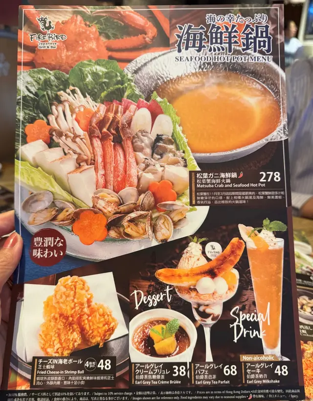 銅鑼灣 Firebird 日式 居酒屋, 糸我們喜歡的聚腳點, 飲酒食野好方便. 餐廳裝修好時尚. 開放式廚房, 師傅專業燒物, 又設有吧座.餐牌有多頁, 串燒品種多.秋冬天氣涼, 重有 海鮮鍋, 頂吸引.還有 特式海鮮配飲品套餐 也不錯, 只須 $198/p. (包前菜, 食物 3 選1, 另配自選飲品) 朋友即點. 餐飲 我們選了 Berry Kisses, 另單叫 Mix Fruit Tea, 冰冰凍, 味道有果香, 內有多款鮮水果, 有點像西班牙酒 Sangria, 改配茶味, 好飲啊 !套餐前菜: 牛舌豆腐煮, 牛舌煮得稔, 配上口感嫩滑豆腐, 食得 美妙.套餐主食兩款, 其一: 脆炸軟殼蟹, 伴蘿蔔蓉醬油. 軟殼蟹外皮炸到卜卜脆, 內裡酥軟, 令人無盡回味. 另套餐主食二: 蟹味噌甲羅燒 蟹蓋內載有蟹膏, 蟹肉. 蟹稃, 另備紫菜飯團同食.先把蟹肉蟹膏等混合, 甘香幼滑, 鮮味濃郁, 把有滑溜蟹醬塗上飯團, 卷 入紫菜包內一起吃, 比 壽司更好吃. 特上牛肉串燒盛合 (5 串): 分別用了不同食材: 日本產和牛肉串, 牛肉金菇/蔥串, 秋葵串, 配日本蛋漿. 飲品配燒物, 很滋味. 先吃 日本產和牛肉串: 肉質嫩滑, 牛味濃, 帶有肉汁, 夾上爽口長蔥, 好好食.薄切牛肉串, 面燒得焦香, 包著金菇, 輕燒後帶出牛肉香味, 金菇吸收了牛油香. 食得滿意. 另 牛肉卷內包有青蔥, 爽口較爽, 肉汁豐富, 啖啖充滿著牛油香.秋葵串, 新鮮爽脆, 秋葵中心滑滑的黏液, 有點滑潺潺的感覺, 可降低膩, 極美味.今晚天氣有點涼, 至岩食 松葉蟹海鮮火鍋: 用鐵鍋盛載 連同火具這送上. 服務員提醒小心鍋仔好熱.材料好豐富: 有松葉蟹腳 4 隻 , 生蠔 4 件, 蜆, 蘿蔔, 豆腐. 生菜......食材新鮮, 排列整齊乾淨.我們 慢慢把食材 逐一 放入湯鍋. 一邊滾一邊食. 蘿蔔蔬菜清甜, 豆腐滑有豆香松葉蟹腳 , 好好肉, 味道甜, 又嫩滑.生蠔有4隻, 蠔肉飽滿, 蠔味濃, 大蔥, 吃 得滿意. 海蜆無沙, 味鮮美. 餐廳人氣旺, 上菜快, 食物夠鮮, 燒物火鍋做得好, 店員細心, 大家吃得爽.…查看更多
