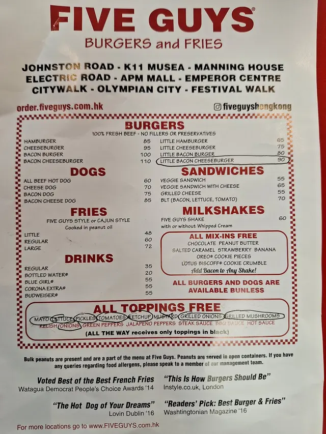 講真食快餐好多時候都係貪快,但係食Five Guys絕對唔係。其實係希望好好享受佢個杯奶昔。今日帶咗兩個新朋友去Five Guys 度食嘢,原來佢哋從未食過,咁就等我發辦揀啱佢哋口味嘅漢堡同埋薯條。奶昔,我地三個人叫兩杯夠晒㗎啦。Burger揀咗Double cheese Bacon burger另外揀咗個三文治今次一個新嘗試,但係幾唔錯當佢哋見到嗰個薯條山嘅時候佢哋都話咗一聲。係呀,burger出名好食,連薯條都係出名多同埋誇張。熱奶昔係絕對絕對絕對要加煙肉碎㗎。佢哋一聽嘅時候都會覺得好奇怪但係飲落去就會知道點解需要加鹹香嘅煙肉落去,因為真係成個味道去咗另一個層次。…查看更多