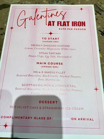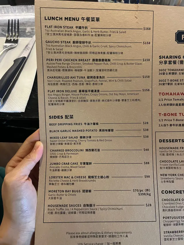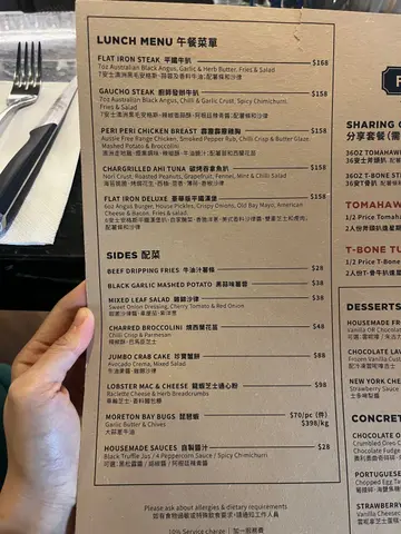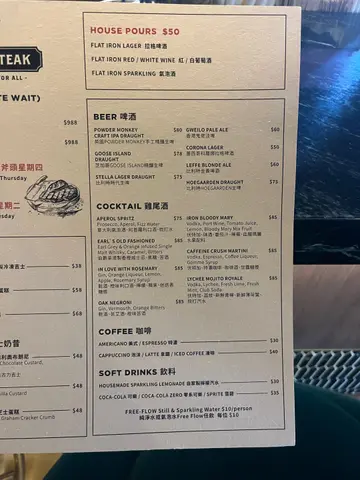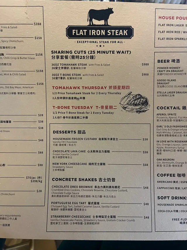 We have been to the original Flat Iron Steak house next to the Vission Cookie which was quite value for money in a year ago.We wanted to revisit this agin and hoped it can maintain its quality and value.However, we were quite disappointed about the Chateaubraid steak which costed $698 for 500 g. We ordered the medium well . This rare part should be soft ,tender, and rich in flavour. It tuned out was tense, lean, and one third of chopped pieces are well done. This meant the steak was not cooked evenly with same temperature. This was totally below our expectations and quite below the standard . …查看更多