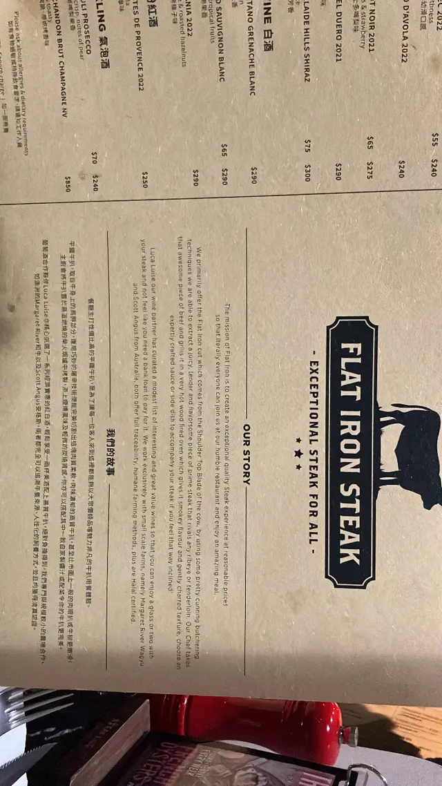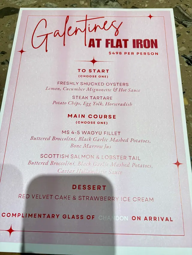 I recently dined at Flat Iron to celebrate my anniversary, and it was an unforgettable experience. The steak was incredibly delicious, cooked to perfection with a delightful balance of flavors. The ambiance of the restaurant was fantastic, creating a warm and inviting atmosphere that enhanced our celebration. The staff were friendly and attentive, making us feel welcome and ensuring we had a memorable evening. Overall, I highly recommend for a special occasion or simply a great meal.…查看更多