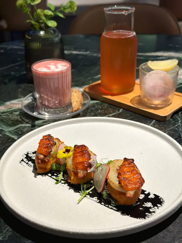 烤八爪魚片 配 海膽醬,新薯片,煙燻紅椒薯蓉