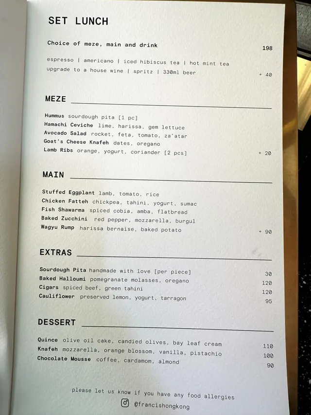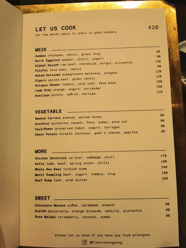 Friday night we got lucky to sit by the bar table, we called at noon to book a table and they said it’s the last spot and of cos we took it.There were a lot of dishes we would like to try but just the two of us therefore we could only order 6 dishes, at the beginning a waiter suggested us 4-5dishes would be enough and I thought wait til you see how much I eat..Kicked off with smoked EggplantLamb ribs Not sure about the portion as they took off the meaty part and served just a little bit of meat sticks to the bone, taste was perfect though.Grilled LeekThought it’ll be a hot dish but turns out it’s a cold one, comes with feta, onion and potato, a bit sour. Grilled ClamSize and taste were amazing just that the texture were too hard to chew, over cooked.Grilled prawn with couscous.Highlight of the night- no words needa describe, the carbs soaked all the juice & seasoning were mind blowing.KnafehOnly if the crispy part were serve straight out of oven/cooker then would be heaven.Usually everyone starts with hummus yet we leave that to the last part, at the end we were too full. Therefore we’ll save it for next visit.Thank you.…查看更多