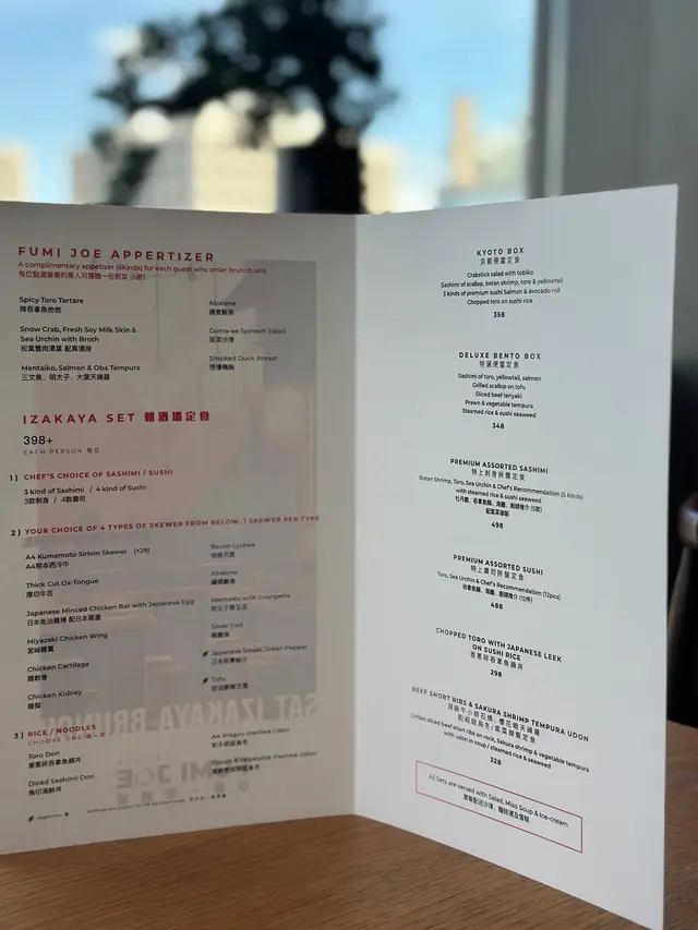 週末最鍾意去中環輕鬆食brunch😬 今日去蘭桂坊加州大廈23樓嘅Fumi Joe,佢哋最近換咗新餐牌,星期六嘅Izakaya Brunch, 有好多好評😎 現代和風設計, 仲有吧枱,用餐氛圍非常輕鬆舒適,落地玻璃窗可以欣賞中環城景,建議大家book窗邊位置🫶🏻🌟SAT IZAKAYA BRUNCH $398 p.p. 🧆前菜:六款Brunch以六款精緻前菜拉開序幕,擺盤精美,每一款都可以獨當一面,非常高質🤩 包括松葉蟹肉湯葉、辣吞拿魚他他、三文魚明太子天婦羅、磯煮鮑魚及菠菜麻醬沙律、煙燻鴨胸👍 職員非常細心介紹我哋由左至右品嚐🫶🏻🍣壽司精選四款可以揀刺身或者壽司,我選擇咗四款壽司包括吞拿魚、油甘魚等精選食材。佢嘅魚生固然係非常新鮮,但係我非常欣賞佢嘅醋飯,溫度、酸度同紮實度恰到好處,師傅嘅握工果然犀利👍🍢串燒四款Fumi Joe嘅串燒真係非常出色,我選擇咗四款串燒:宮崎雞翼、銀鱈魚、A4熊本西冷牛同厚切牛舌。最欣賞嘅係A4熊本西冷牛,厚切而且肉汁非常飽滿,肉質鮮嫩👍👍👍 雖然要加$28,不過非常超值,食過你就知😎 銀鱈魚亦都係必食,以西京燒方式處理,味道帶甜,魚肉軟嫩👏🍚主菜:角切海鮮丼主食我選擇咗角切海鮮丼,唔好睇佢細細碗,裏面質滿咗勁多海鮮😎包括吞拿魚、三文魚、帶子等,全部都係味道鮮美,特製嘅醬汁有麻油嘅香味,每一啖都好滿足🤩 隨丼飯附上嘅味噌湯都唔錯呀😬🌟特上刺身拼盤定食 $498如果想試多啲嘢食,強烈建議叫呢個$498特上刺身拼盤定食, 呢個定食同樣都會跟六款前菜🤩拼盤陣容好豪華,包括鮮甜牡丹蝦、油脂豐富入口即化嘅吞拿魚腩(Toro),仲有中拖羅、鮮甜海膽毫無腥味👏 鮮美彈牙嘅帶子🫶🏻 每樣刺身都有兩件👍 呢個定食會跟一碗白飯同埋麵豉湯🫶🏻 🍦甜品兩份套餐都會包一杯濃郁嘅黑芝麻雪糕,作為一個完美嘅ending🥰 🍶清酒 $$58Brunch當然少不了飲番杯,我哋就每人叫咗杯清酒,相當大杯👏 另外當然有free Flow嘅package可以選擇,鍾意飲番杯嘅記得留意吓🥳Fumi Joe環境開揚,坐bar枱可以睇到師傅即席製作食物,靠窗位置可以飽覽中環靚景🤩 staff全部都好nice,令用餐體驗更加分🤩 如果你週末想搵個舒適又可以享受高質日本料理嘅地方,Fumi Joe絕對值得一試。呢個價錢喺中環嚟講真係冇得輸😎Fumi Joe地址:中環蘭桂坊德己立街30-32號加州大廈23樓…查看更多
