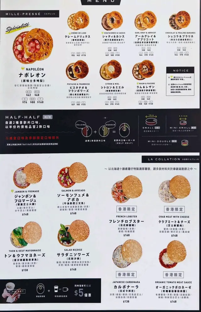 呢間日本千層拿破崙Mille-presse即叫即製!酥皮非常鬆化,外層仲有層焦糖🤤最近仲出咗small 同 Mini size⭐️原味士多啤梨 (S)🍓招牌口味,吉士忌廉幼滑配上新鮮切片士多啤梨,香甜美味⭐️開心果忌廉覆盆子 (S)大熱開心果,開心果忌廉香濃配上酸甜覆盆子醬,開心果醉增添口感Mini size (4.5-5 cm)呢個size用嚟做散水餅一流⭐️冧酒提子(mini)淡淡酒香,配上粒粒香甜的提子乾,下次呢個要叫大size⭐️提拉米蘇 (mini)喜愛咖啡人士福音,好香咖啡味,cream好香,餅乾碎增加口感…查看更多