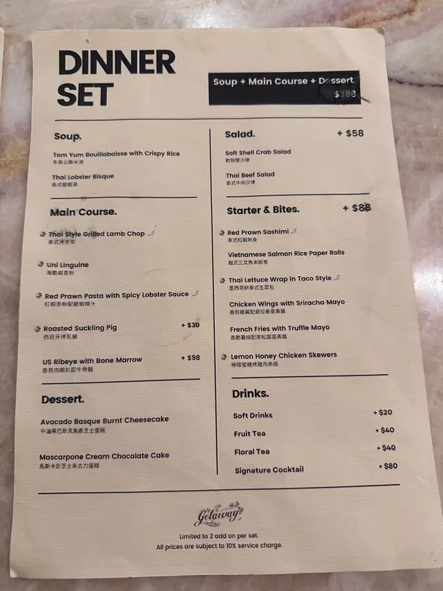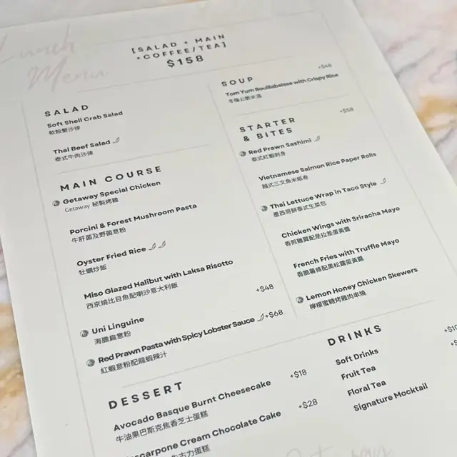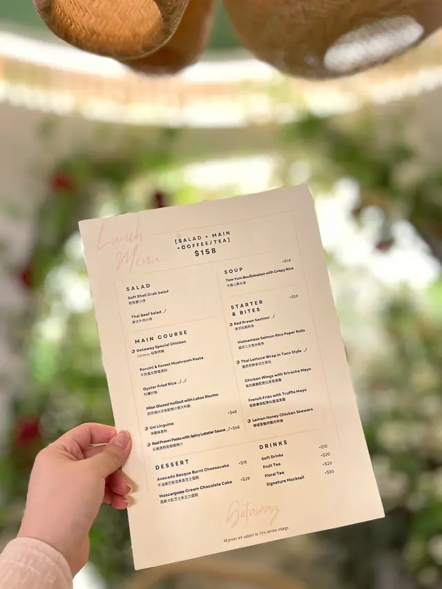 Getaway,中環岩里渡假風餐廳 整體來說,中環岩里渡假風餐廳 Getaway特別是烤乳豬和檸檬蜜糖烤雞肉串燒更是無可挑剔。餐廳的環境舒適,服務也很周到,絕對是享受美食的好去處⭐️🥂🩵DINNER SET $398⭐️ Getaway 秘製烤雞 $328這道烤雞是餐廳的招牌菜之一,外皮香脆,內裡肉質鮮嫩多汁。秘製醬料更是令這道菜增色不少,讓人一試難忘⭐️ 冬蔭公脆米湯這道湯品帶有濃郁的泰國風味,香辣可口。脆米的加入,使得口感更加豐富,讓人一喝難忘。⭐️ 西班牙烤乳豬 加 $30烤乳豬皮脆肉嫩,香氣撲鼻。配合細緻的西班牙香料,味道層次豐富。雖然需額外付費,但絕對物有所值。⭐️ 檸檬蜜糖烤雞肉串燒 加 $88這道雞肉串燒甜而不膩,檸檬的酸香和蜜糖的甜味完美結合,肉質嫩滑多汁,是一道非常值得推薦的選擇。⭐️ 馬斯卡彭芝士朱古力蛋糕甜品部分是這道馬斯卡彭芝士朱古力蛋糕,濃郁的朱古力味道和柔滑的芝士口感,為這頓晚餐畫上完美句號。⭐️ 香煎雞翼配是拉差蛋黃醬 $98香煎雞翼外皮金黃酥脆,雞肉滑嫩多汁。配上帶有微辣味道的是拉差蛋黃醬,更是令這道小食充滿層次感,令人食指大動。…查看更多