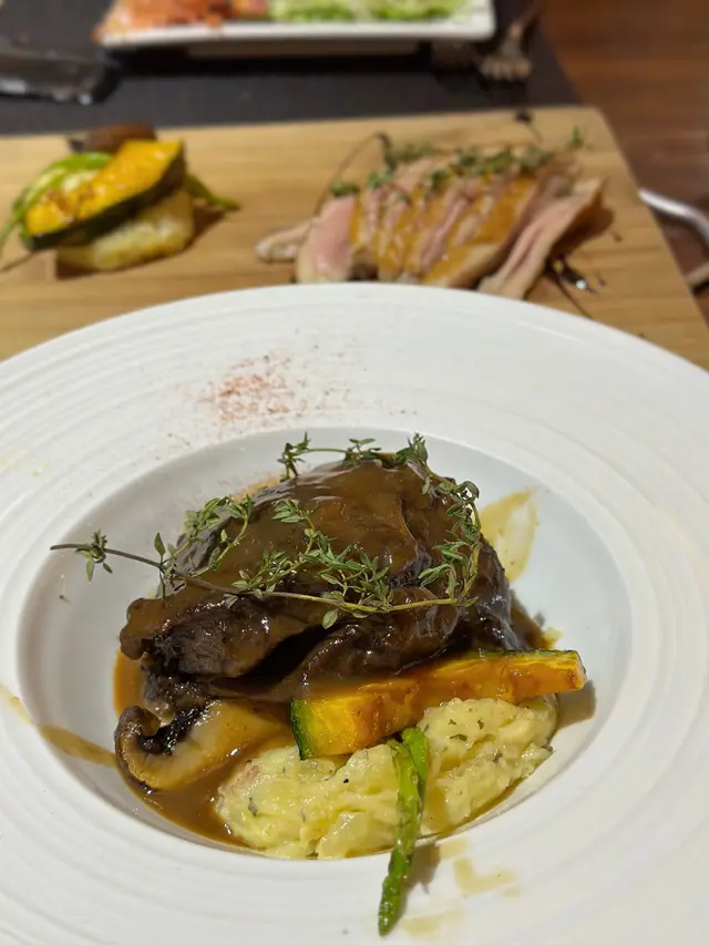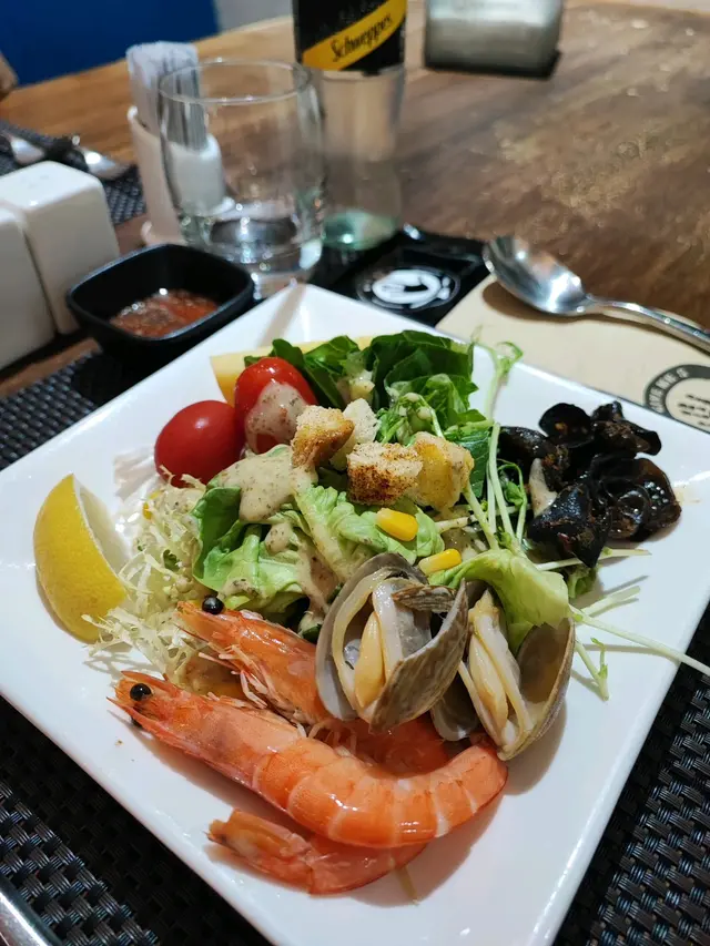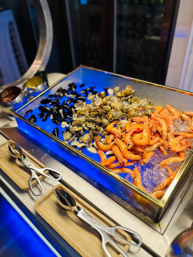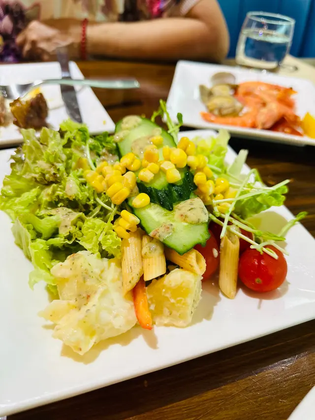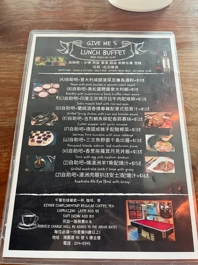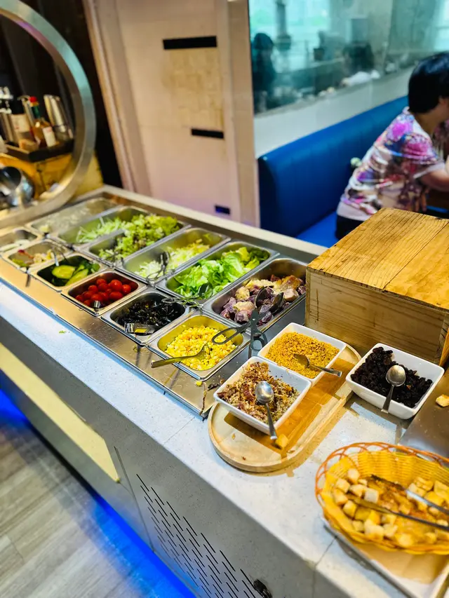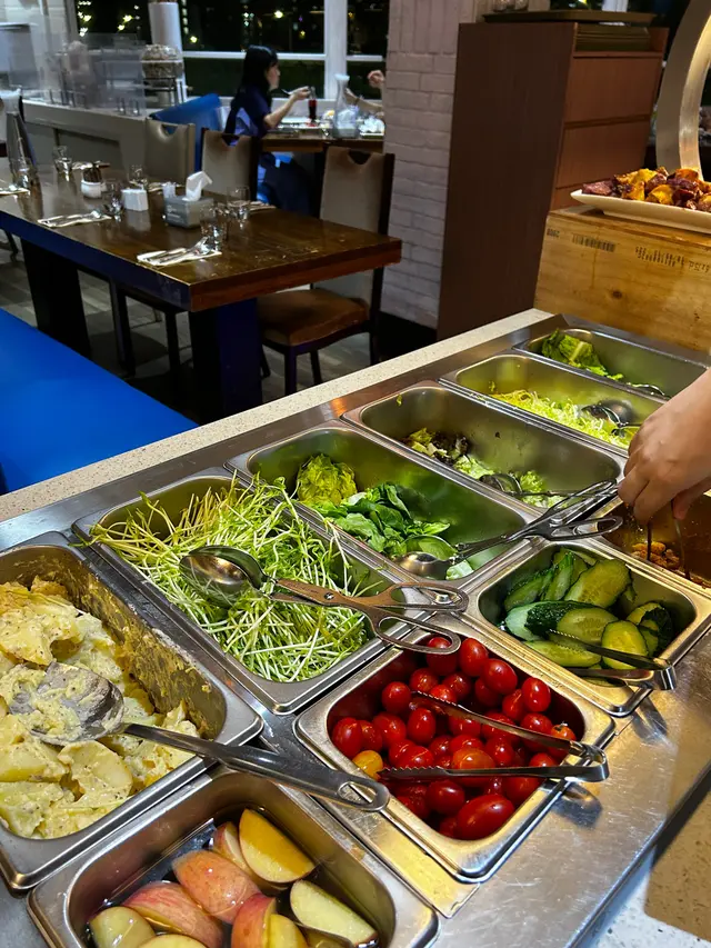 呢度 Lunch Buffet 星期一至日都有,12:00-15:00,諗起想食就黎喇。(A) 香煎大蝦紅菜頭忌廉意大利粉(J) 澳洲肉眼扒 (8安士) 配燒汁沙律吧最吸引我,菜好新鮮,有連皮蘋果片、 蓮藕片、 長通粉、 脆脆麵包粒都必食。加上醬汁有4款選擇, 和風汁、英倫千島醬、 香草油醋汁、日式胡麻汁,次次唔同醬汁都得。熟食方面食哂一款會換上另一盤其他款式,咁啱俾我遇到剛出爐既日式關東煮,有雞蛋、魚蛋、獅子狗 、福袋, 熱辣辣~~ 當我地食緊自助吧既時間,大廚親自遞送上兩份主食,感覺親切及誠意。…查看更多