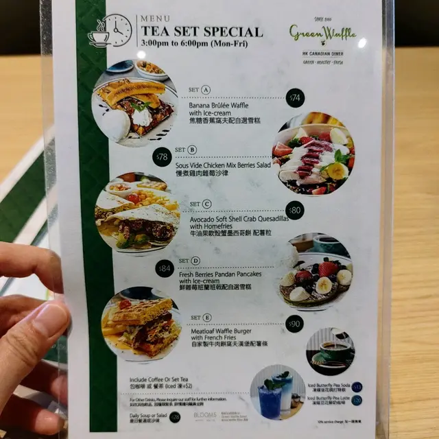 開業初期用餐多次,食物及飲品質素唔錯,但早期沒套餐選擇,晚膳多數散叫,價格頗貴,而四週還有很多更好的選擇,所以...不經不覺已超過兩年沒再幫襯了。前陣子有朋自遠方來🥰姊妹閒日放假突然到訪元朗找吃午膳,當然要搵個好坐啲嘅地方,可悠閒地享用午餐😋來到久違了一段時間沒幫襯的Green Waffle,看到餐牌相片都好吸引,午市有套餐選擇又啱口味,決定入座😏剛好被安排到餐廳角落邊的四人枱,但位置開揚,二人就自然坐得更舒適👍🏻各自選好口味下單,食物及飲品質素都👌🏼不錯,但不算有太大驚喜🙄不過不失啦😅是日餐湯~ 南瓜忌廉湯,香濃南瓜甜味,入口滑溜,有飽肚感😁🤭兩款不同的主菜可分嚐😁其中一客包甜品...半份窩夫🧇餐廳服務都唔錯,服務員又不時主動替客人添加水,慢慢歎著杯茶都消磨了整個下午😄要給讚的👍🏻奶茶夠濃滑☕合口味😋💯想不到很快又有機會再來幫襯😋因較早前才跟姊妹吃完唔錯,另一半下午放假,決定再到來午膳,驚喜發現原來閒日不同日子餐牌有轉換😃👏🏼而且有更好的選擇😋更合另一半胃口👍🏻"笑臉"
