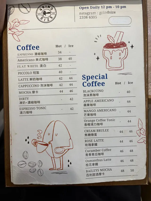 和朋友在創興廣場逛完展覽後搵晚飯食,在朋友帶路下,來到了Grind Size這間cafe。店舖分兩層,樓下有些吧枱位,而樓上則設有部分梳化位及地墊座位,樓上的格局令人感覺較為悠閑。點了幾份主食與一份小食和朋友分享,香煎牛油虎蝦手工蝦汁手工扁麵,份量不多。手工扁麵幾有咬口,蝦汁味道都算香濃。慢煮原條八爪魚🐙墨汁香辣意粉,八爪魚觸手好大件,卻又煮得夠軟稔,完全不會韌!墨汁滿滿的沾勻每一條意粉,味道夠香,加上微微的辣,就更為惹味!黑毛豬叉燒卡邦尼手工幼麵,叉燒份量適中,以黑毛豬製成的叉燒,軟稔又帶點油脂香與肉香,略嫌卡邦尼醬汁味道不夠香。煙肉芝士薯泥夾心酸忌廉排包,排包的面層是滿滿的配料,又香又軟滑的薯泥,鋪上煎得微脆的煙肉,加上芝士及酸忌廉,已經夠滋味。最面層還有兩隻太陽蛋,蛋汁配上豐富配料的麵包,令人滿足!明太子蟹肉西班牙蛋餅,蛋餅的賣相不錯,面層澆上沙律醬,還灑上大量的蟹籽與櫻花蝦。一切開蛋餅,裏面有些蟹肉,而且帶有蛋汁。雖然不太嚐到明太子獨有的鹹香味,但這份蛋餅的味道都很好!點了兩款甜品,Tiramisu,竟然提供1 shot espresso讓食客自己倒於甜品上。咖啡酒香濃而不苦,ladyfingers吸滿咖啡,mascarpone的淡淡奶香,並灑上可可粉,是很好吃的一份Tiramisu。不是飲品.凍檸茶,而是紅茶味道的心太軟,配上青檸雪葩。切開心太軟,流出來的不是朱古力漿,是紅茶漿,配上清新的檸味雪葩,令整體形成檸檬茶的感覺。Grind Size主打賣啡,有一位朋友飲Orange Coffee Tonic,嚐到咖啡香之餘還帶微微清新橙香。Iced Rose Latte,一杯凍的玫瑰🌹牛奶,搭配咖啡,也是讓食客自行傾注。醇香的咖啡帶有玫瑰花香,口感順滑。Iced Matcha Milk,提供一樽凍鮮奶,還有茶刷讓人自己泡抹茶,甜度也是由食客按口味調整,有得飲之餘又有得玩。紅棗蘋果茶,兩者的味道平衡,帶蘋果的淡淡香甜。不論主食、甜品或飲品,整體的味道不錯,只是價格略貴。不過這一頓晚飯充滿玩味,所以都值得試試的!…查看更多
