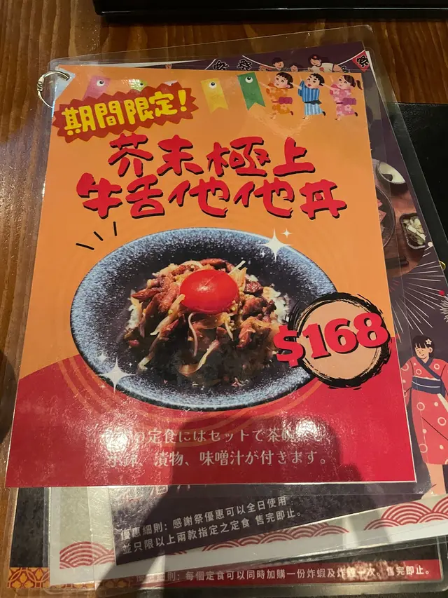 薄燒牛舌定食 ($178) ★★★★★這份定食有漬物、沙律、麪豉湯、茶碗蒸,非常豐富,正常食量的食客叫1倍牛舌便夠飽。麪豉湯和茶碗蒸味道不錯,而主角牛舌燒得剛剛好,軟嫩有彈性。加上檸檬汁及wasabi感覺更清新,不會太膩。
