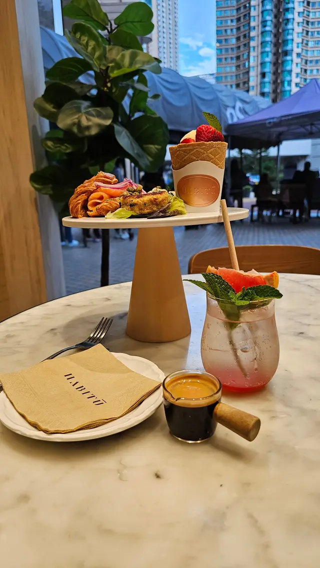 今天和閨蜜約在奧海城的HABITŪ Cafe,純白簡約的裝潢搭配木系桌椅,綠植點綴其間,陽光透過玻璃窗灑落,瞬間讓人放鬆下來~🍰 下午茶套餐 HABITŪ Sweet & Savory Afternoon Tea Set $128(含6款點心+飲品):• 煙三文魚牛角酥 Smoked Salmon Croissant 🥐酥皮層次分明,三文魚鹹香搭配奶油芝士,口感豐富• 手工蟹餅 Homemade Crab Cake 🌊外皮煎得金黃,內裡蟹肉絲絲分明,鮮味十足• 開心果撻 Pistachio Tart 🌰撻皮酥脆,開心果餡香濃不甜膩• 奧地利朱古力蛋糕 Sacher Cake 🍫濃郁巧克力風味,中間夾層杏桃醬恰到好處• 蘋果金寶 Apple Crumble 🍎熱騰騰上桌,酸甜蘋果與肉桂香超治癒• 意大利雪糕杯 Gelato in Waffle Cup 🍦香草雙球配脆脆甜筒,冰涼滿足☕ 飲品方面:閨蜜點了白咖啡 Misto,順滑香醇;我選了熱朱古力 Hot Chocolate,濃厚不會太甜,搭配點心剛剛好。這裡座位寬敞,音樂輕柔,非常適合姐妹聊天享受慢時光。整體來說,食物表現中規中矩,但環境舒適,是個能讓人忘掉壓力的愜意角落~…查看更多