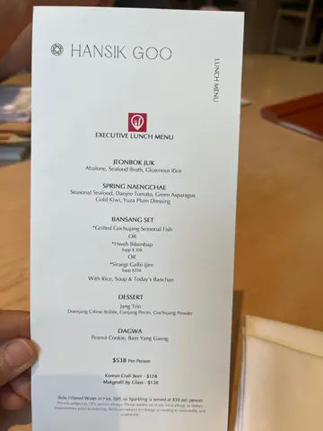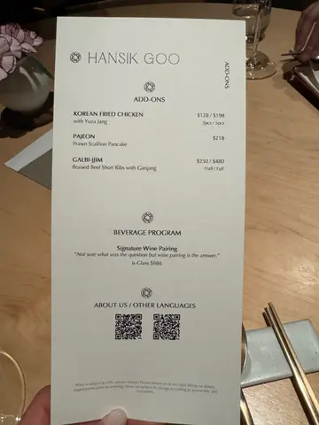 🥰 話說 Mosu 因為 “黑白大廚” 而 聲名大噪, “預約困難” 了. “紅猴” 推介另一間韓國餐廳 Hansik Goo, 食物水準更高, 味道更體現韓國文化. 晚餐 $1,388+100%. 美酒配對 $888+10%, 共六杯, 三杯葡萄酒, 三杯韓國酒. 餐廳裝修 簡單平淡, 格局少似 Whey 及 廚魔.🦑 Cuttlefish Seasoned with Salted Clam Sauce. 墨魚唔韌喎, 出色嘅一體感.🐚 Samhap - Pyeonyuk, Oyster, Aged Kimchi. 泡菜冇搶味, 蠔味緩緩滲出, 不俗!🦀 Snow Crab, Summer Vegetables, Corn Pine Nut Sauce. 韓式沙津, 汁底一流!🐂 Morel Mushroom, Stuffed Lotus Root, Abalone, Eel, Beef Tendon, Beef Broth. 韓國牛骨湯, 熱辣辣, 好好食.🍙 Jeju Abalone, Glutinous Rice, Neungi Mushroom, Perilla Seed. 聞落一陣陣飯焦味.🐟 Seasonal fish with Seafood Stuffing and Fish Broth. 魚肉實淨, 配汁效果出色.🤗 Doenjang Marinated Lamb Chop, Jepi Lamb Jus, Korean Zucchini Rice. 羊肉粉嫩, 掂!🍯 Lime Ice-cream, Grape Granita, Sauvignon Blanc Jelly, Basil. 呢個清下口.🍨 Brown Rice Ice-cream, Buckwheat Chip, Rice Cream, Caramel, Pear Puree. 我麻麻哋甜品.🫘 Doenjang Creme Brulee, Ganjang Pecan, Gochujang Powder. 味道少少似爆谷.☕️ Yakgwa, Heukyimja Dasik. Korean Mulberry Leaf Tea. 甜點唔甜, 合格. 另外, 茶一杯, 唔記得咗乜味.🤗 總結: 菜式充滿驚喜, 又具韓國特色, 係溝通少少難攪. 真心推介.!…查看更多