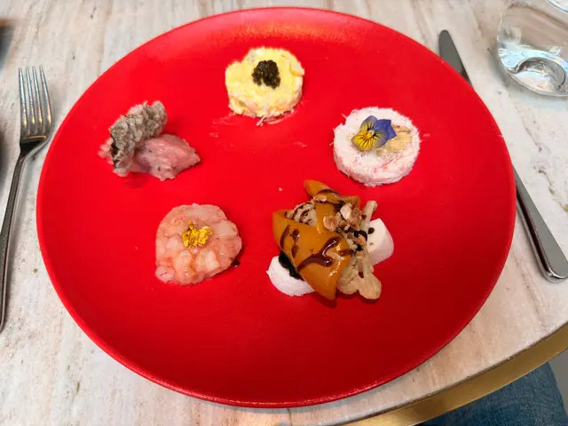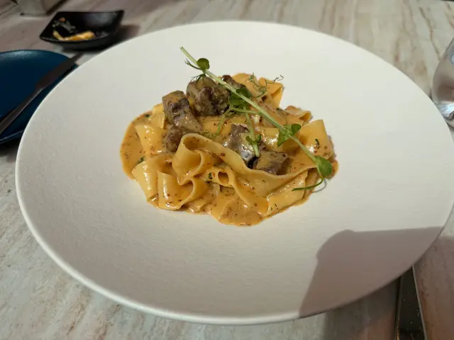 這餐的擺盤非常精緻,每一道菜都像藝術品。前菜色彩繽紛,有花瓣、魚子醬和堅果,味道層次豐富。主菜是奶油醬意粉,麵條彈牙,醬汁濃郁,配料也很入味。甜品是提拉米蘇,口感滑順,咖啡味香濃,薄荷葉增添清新感。整體來說,這是一頓高水準的餐點,視覺和味覺都令人滿足。查看更多