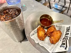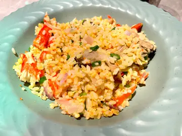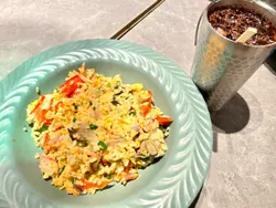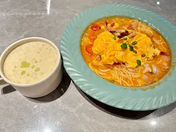 龍蝦湯蛋蓋煙肉天使麵龍蝦湯醬鹹香濃郁,帶有鮮明嘅海鮮味,麵條煮得剛剛好,保持住彈牙嘅口感。炒蛋份量多,味道香濃,整整蓋喺湯麵上面,仲有好多煙肉片同番車厘茄,好健康嘅一碗湯麵。 飛魚子蟹柳炒飯配餐湯炒飯色彩繽紛,金黃色嘅炒飯搭配紅色嘅蟹柳絲同晶瑩閃亮嘅飛魚子。炒飯粒粒分明乾爽,每一啖都充分吸收咗蛋香與調味料嘅鹹香,而蟹柳絲軟嫩甜甜的,仲加左啲菇類加添香氣,咸香味濃,不錯。 加配 BBQ雞中翼焦香四溢,表皮帶有微微嘅金黃色澤。濃郁嘅醬汁帶住輕微嘅甜鹹味。