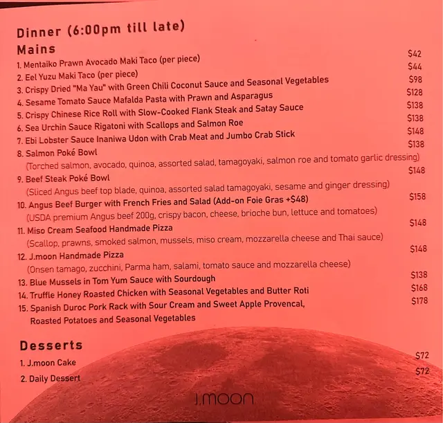J.moon (旺角) 網上訂座即賺Rice Dollars 網址: https://s.openrice.com/QrbS0XwGA00 地址: 香港旺角西洋菜南街1A-1K號百寶利商業中心4樓10-11號舖 電話: +852 95455738