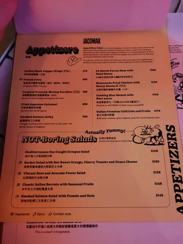 We came to explore the restaurant after watching Jacopo's video 🤭 It exceeds my expectation 👍💕It has variety of dishes and drinks, in range of prices, polite staff. The veggies are fresh, the fried chicken is crispy outside and juicy inside, with nice sauce.The salad is well presented, just that I don't find the egg quite matched to the avocado or beet root. I am not a fan of pineapple pizza, still I gave it a try (Indeed I intended to order apple ..... my mistake). I like smoked salmon pizza with capers. I noted the passion of the family to run the restaurant, keep it up, I will return. If I walk into a trattoria or shop in Italy, they always look into your eyes and greet. HK has a busy culture, I do appreciate Jacomax staff who brought us a drink and confirmed to whom before he put it on the table.…查看更多